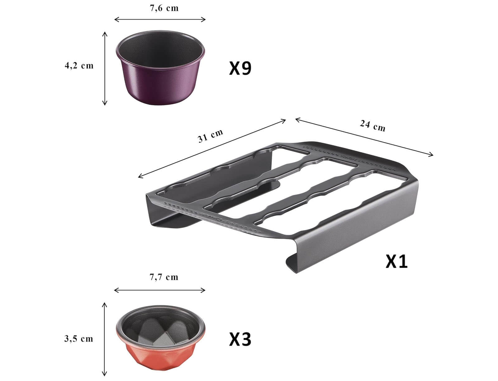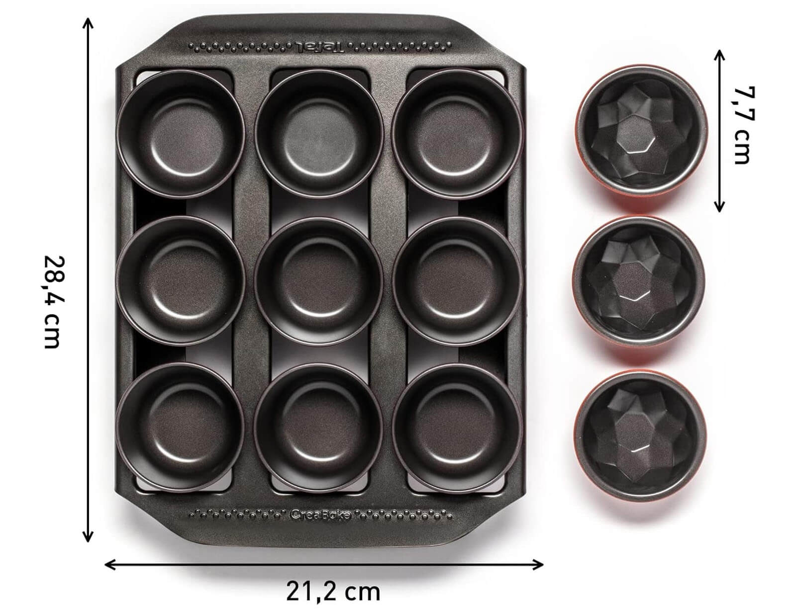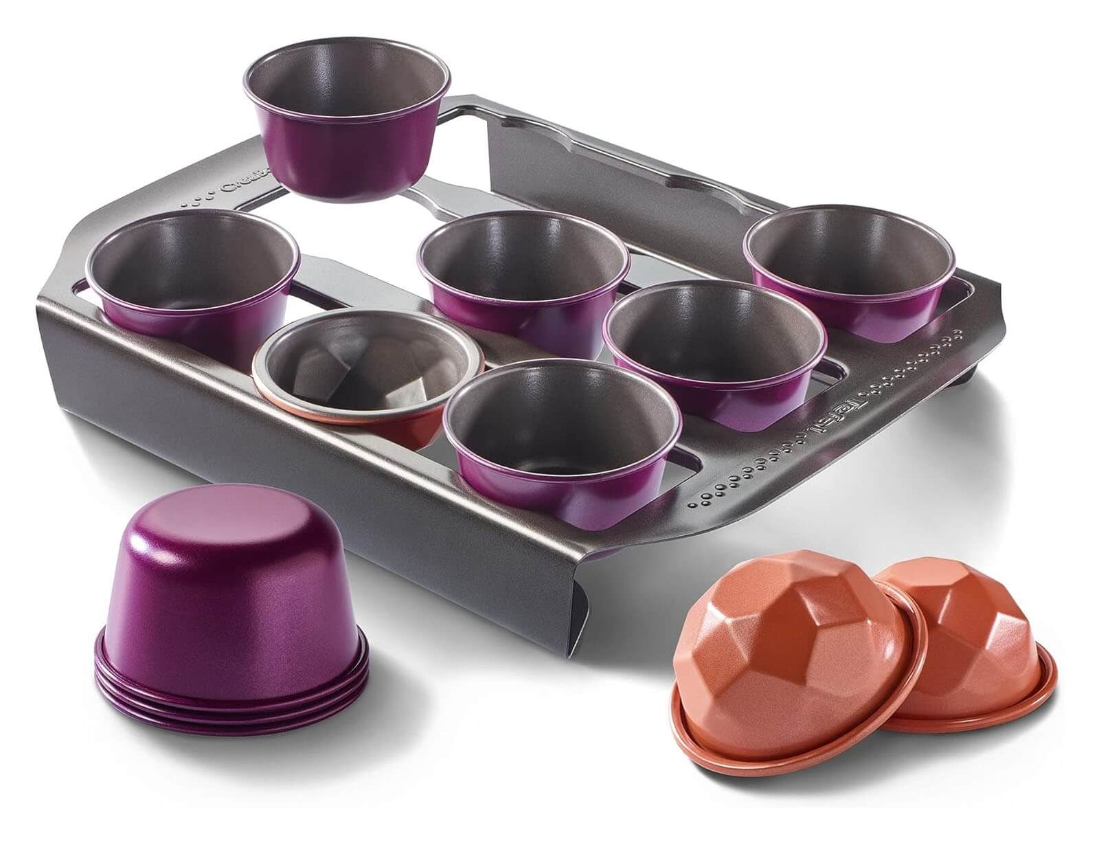 Η βάση με φόρμες για κέικ Tefal Creabake J304SS04 είναι ο απόλυτος σύμμαχος στη δημιουργία μικρών, απολαυστικών γλυκών με φαντασία και στυλ. Το σετ περιλαμβάνει 13 τεμάχια: 9 φόρμες για μάφιν, 3 φόρμες σε σχήμα διαμάντι και 1 πρακτική βάση, που κρατά τις φόρμες σταθερές κατά τη διάρκεια της προετοιμασίας και του ψησίματος.