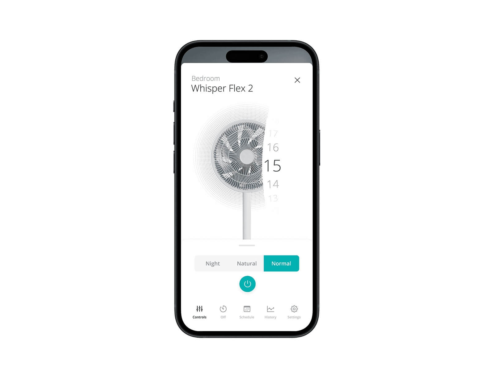 Η ανανεωμένη διεπαφή του Whisper Flex 2 προσφέρει διαισθητική λειτουργία. Η οθόνη LED με χειριστήρια αφής απενεργοποιείται αυτόματα και αθόρυβα τη νύχτα. Το βελτιωμένο τηλεχειριστήριο και το κομψό ματ φινίρισμα με διακριτικές τονικές πινελιές κάνουν αυτόν τον ανεμιστήρα να μαγνητίζει τα βλέμματα σε κάθε εσωτερικό χώρο.