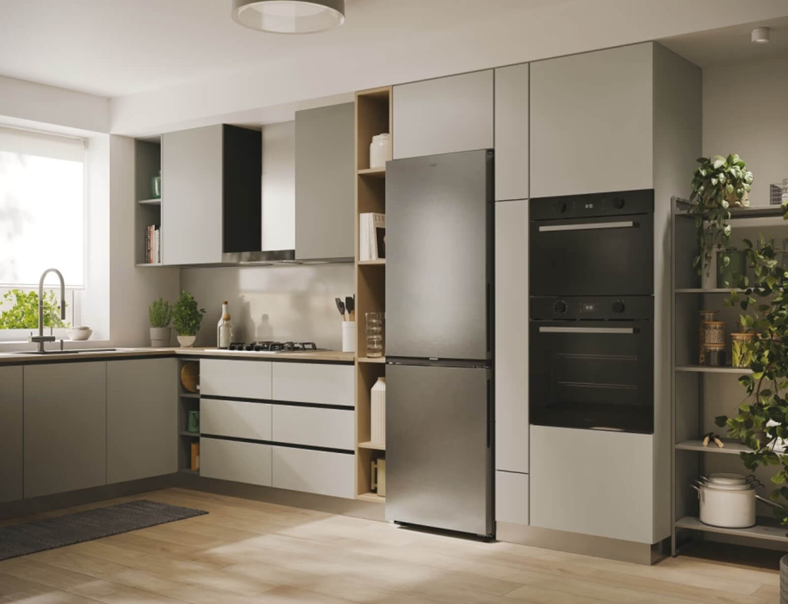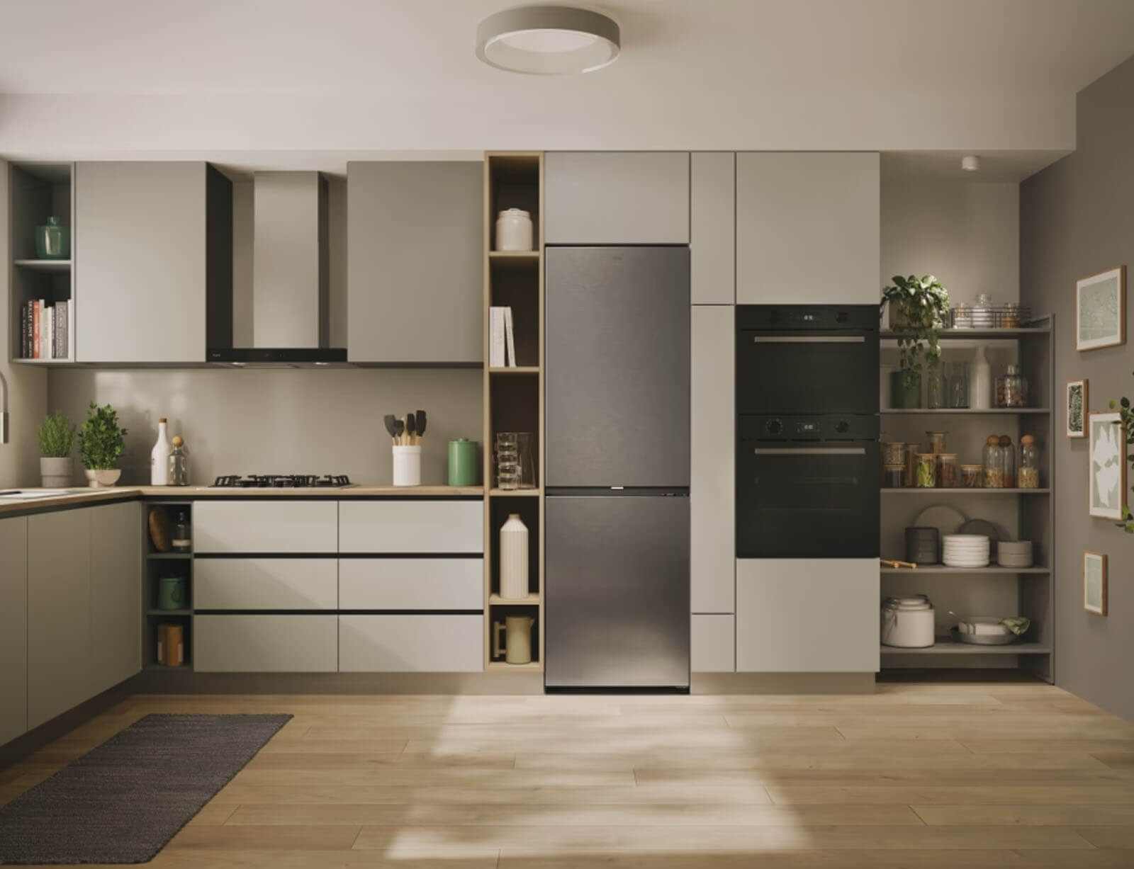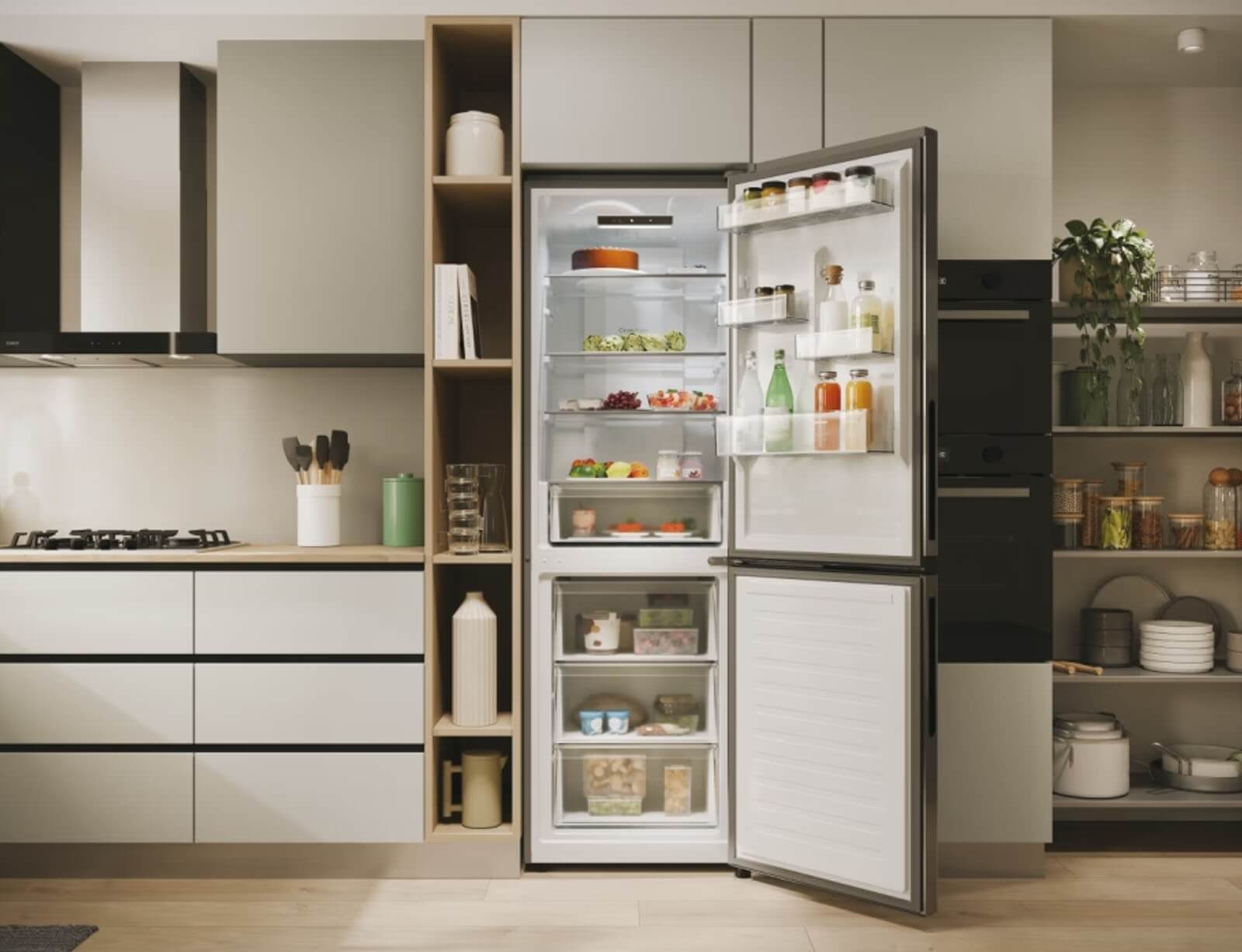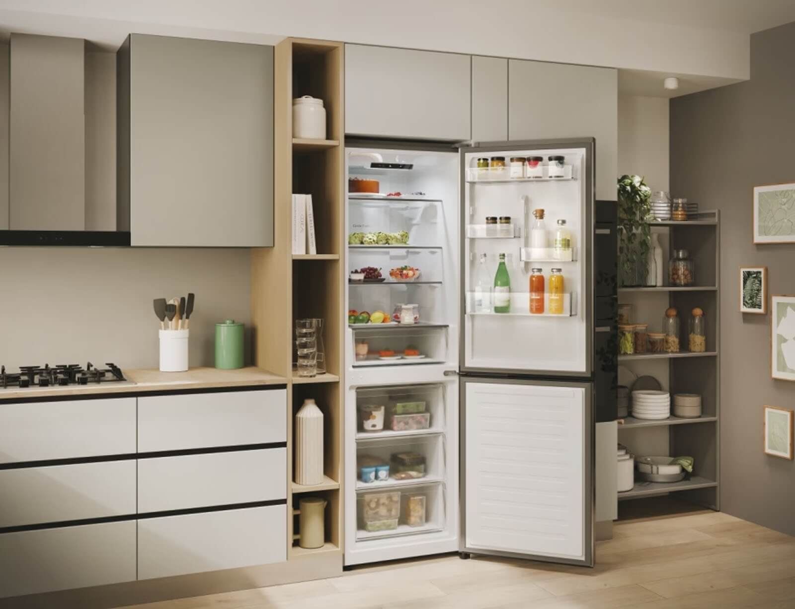 Το ψυγείο ενσωματώνεται αρμονικά στον σχεδιασμό της κουζίνας σας: η λαβή και η μπάρα της πόρτας ευθυγραμμίζονται κομψά με τον πάγκο, ενώ οι κρυφοί μεντεσέδες επιτρέπουν ευέλικτη τοποθέτηση και άνοιγμα πόρτας έως και 90°.