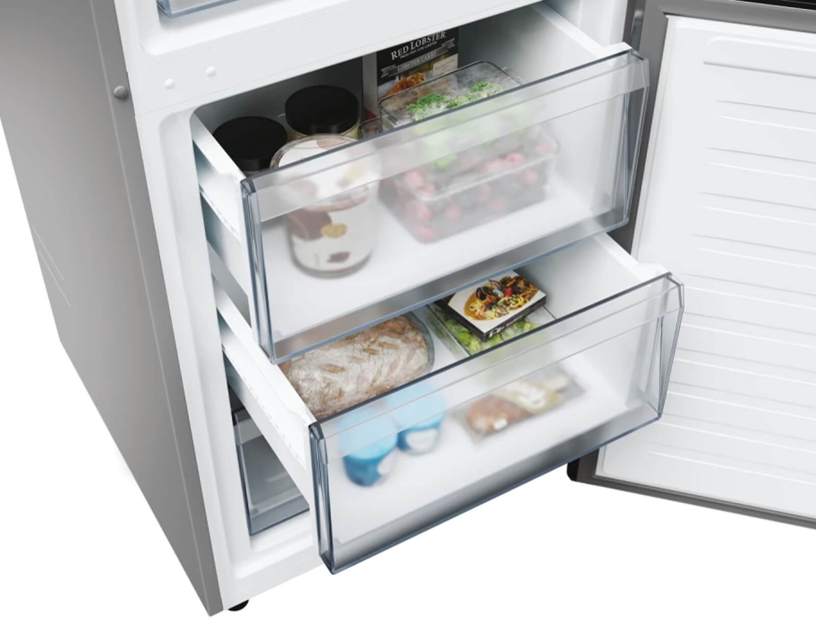 Αυτός ο συνδυασμένος ψυγειοκαταψύκτης σας προσφέρει χωρητικότητα 355 λίτρων σε πλάτος μόλις 60 cm, επαρκή για την αποθήκευση έως και 18 σακουλών με ψώνια. Χάρη στα ευρύχωρα συρτάρια της κατάψυξης, μπορείτε να αποθηκεύσετε ακόμη και τα πιο ογκώδη προϊόντα.