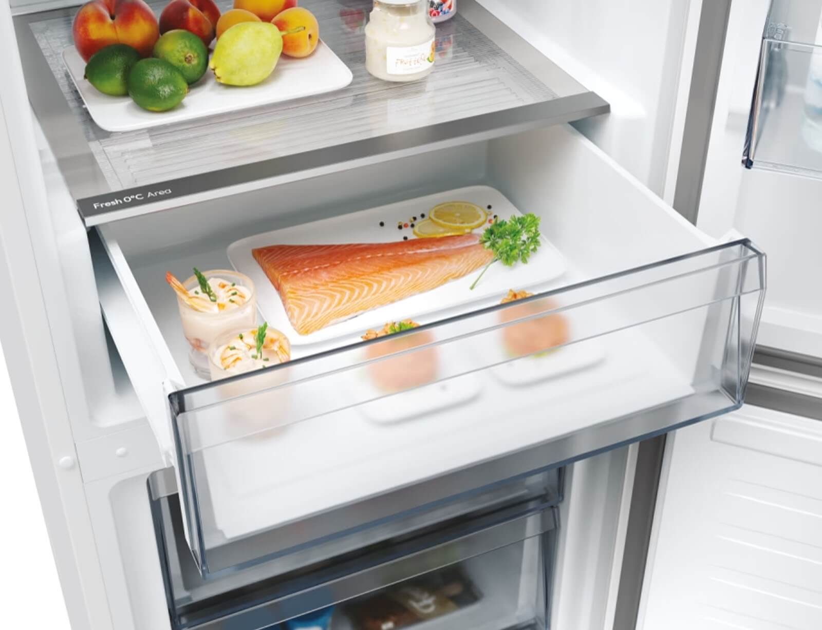 Με την περιοχή Fresh 0°C μπορείτε να ρυθμίζετε τη θερμοκρασία του συρταριού ανάλογα με τις ανάγκες σας: η λειτουργία στους 0°C είναι ιδανική για ψάρια και κρέας, ενώ η απενεργοποίηση του συρταριού προσφέρει επιπλέον χώρο, αποφεύγοντας τη διασταυρούμενη μόλυνση και επιτρέποντας μεγαλύτερη αποθήκευση τροφίμων.