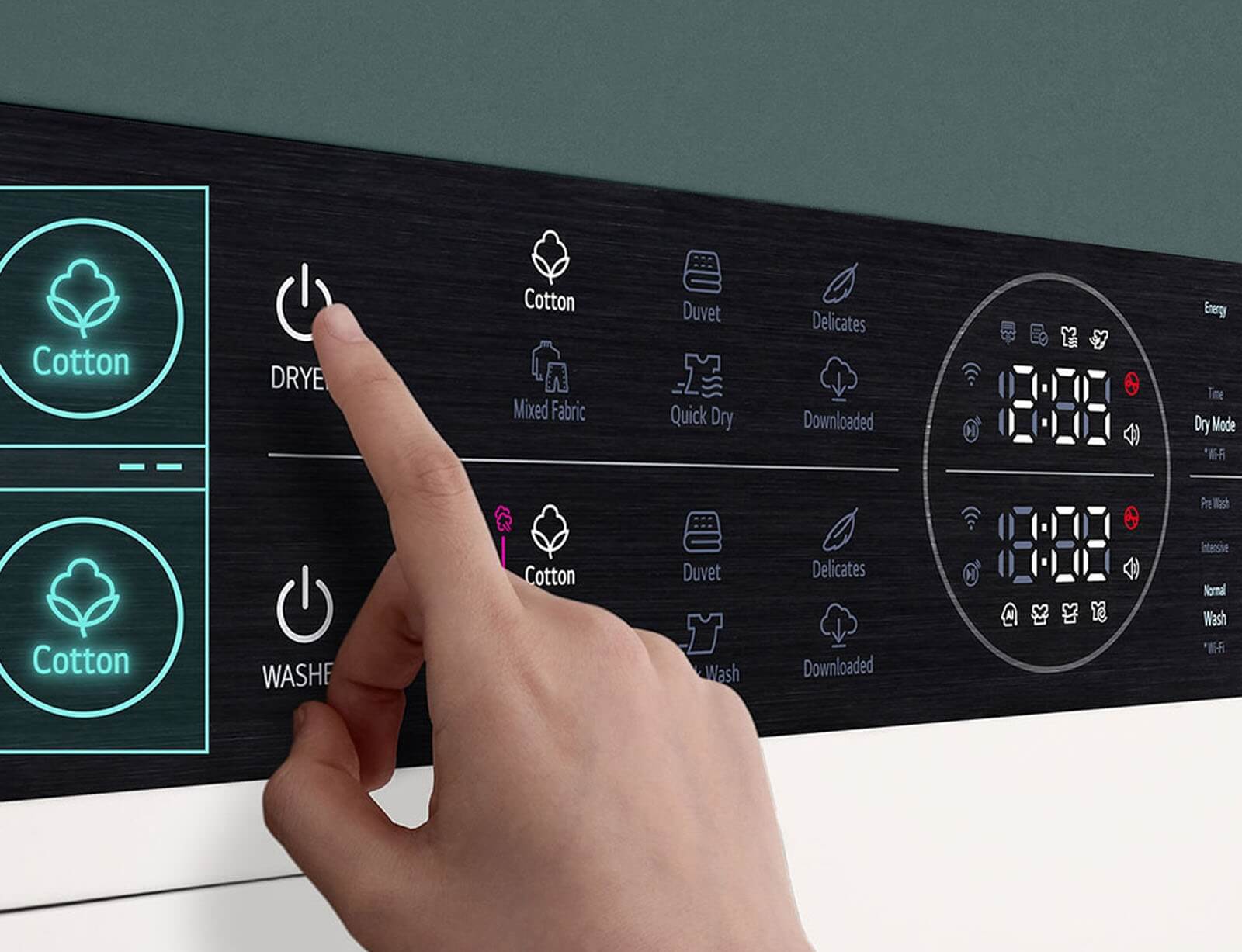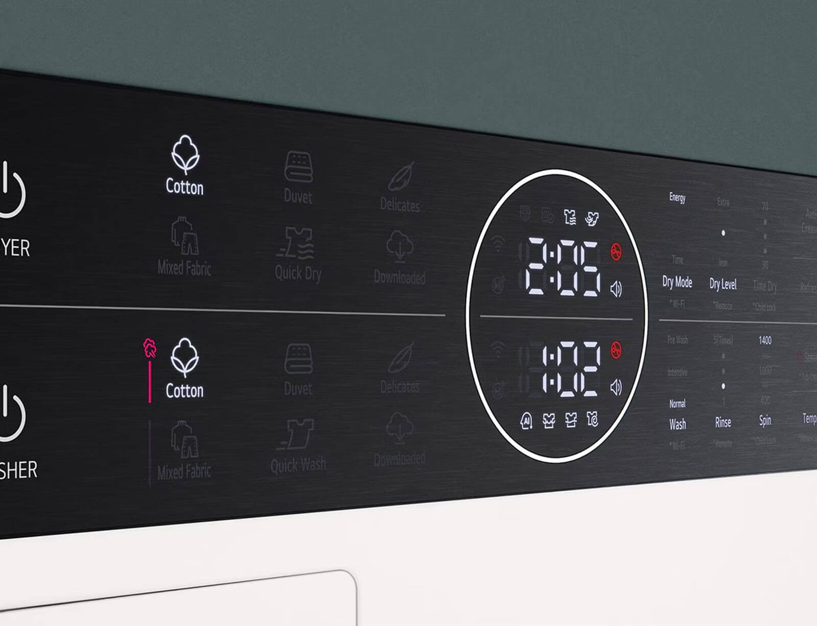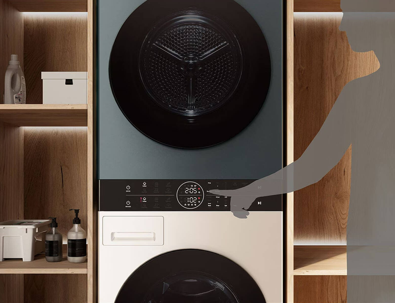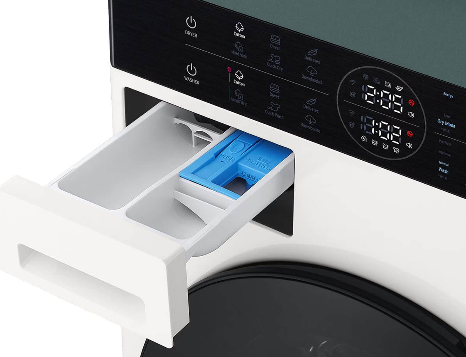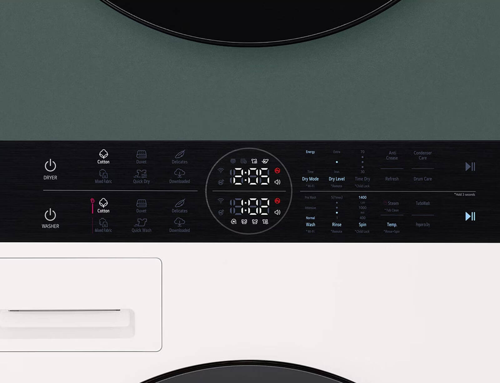 Σε σύγκριση με ένα πλυντήριο τοποθετημένο πάνω από το στεγνωτήριο, είναι κατά είναι 45 mm πιο κοντό και το πάνελ Center Control είναι τοποθετημένο 85 mm.
