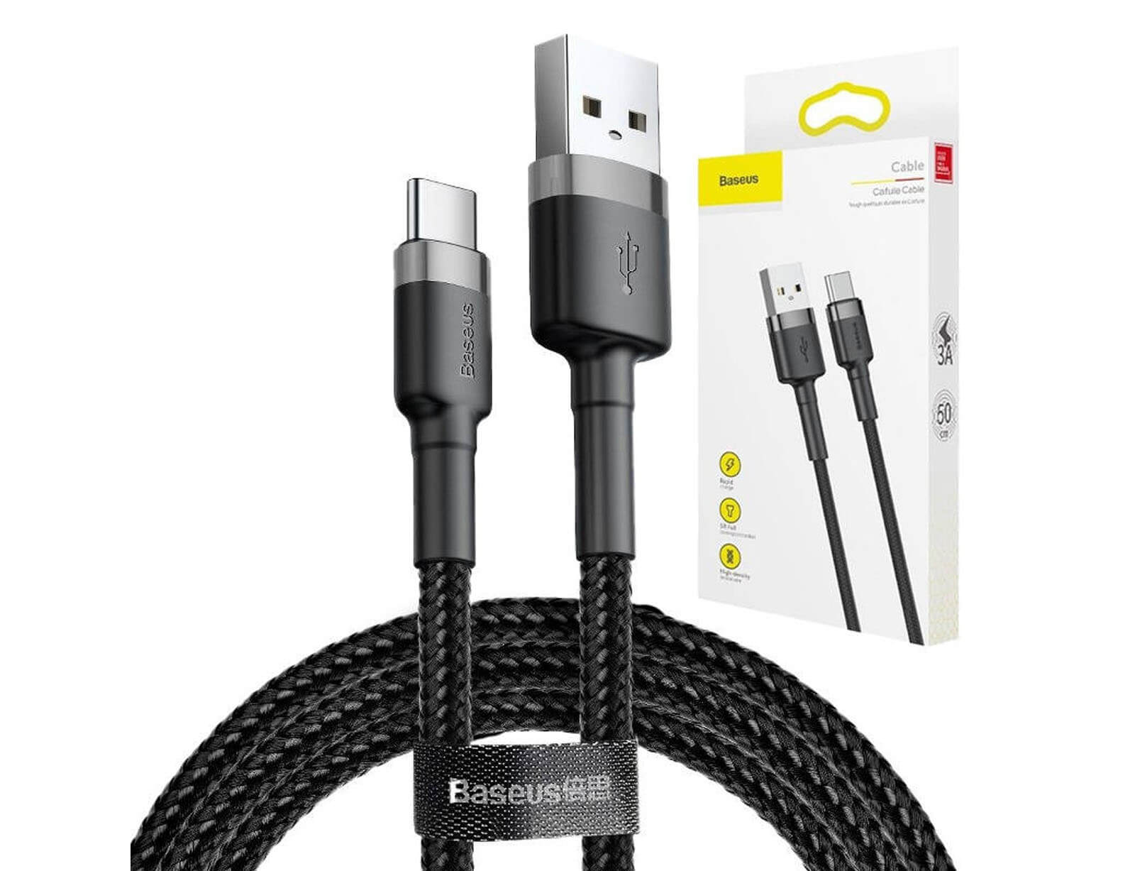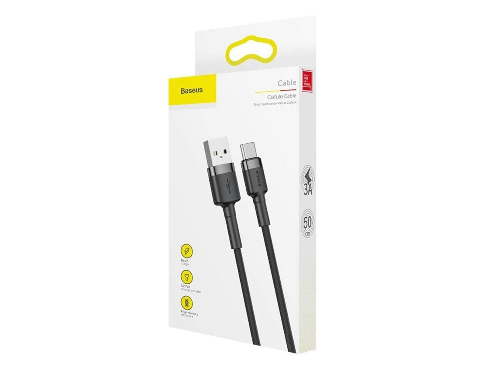 Το Baseus Cafule είναι ένα υψηλής ποιότητας καλώδιο USB τύπου C, σχεδιασμένο για τη μετάδοση δεδομένων και τη φόρτιση συσκευών. Η ενισχυμένη κατασκευή του παρέχει αυξημένη αντοχή στο σπάσιμο (πρόσθετη προστασία στο καλώδιο που καταλήγει στο βύσμα, αλλά και ενίσχυση από πλεκτή επένδυση που διατίθεται μόνο στην έκδοση Cafule). Επιπλέον, στην κατασκευή χρησιμοποιήθηκαν υλικά που ενισχύουν την κατασκευή των βυσμάτων (π.χ. αλουμίνιο).