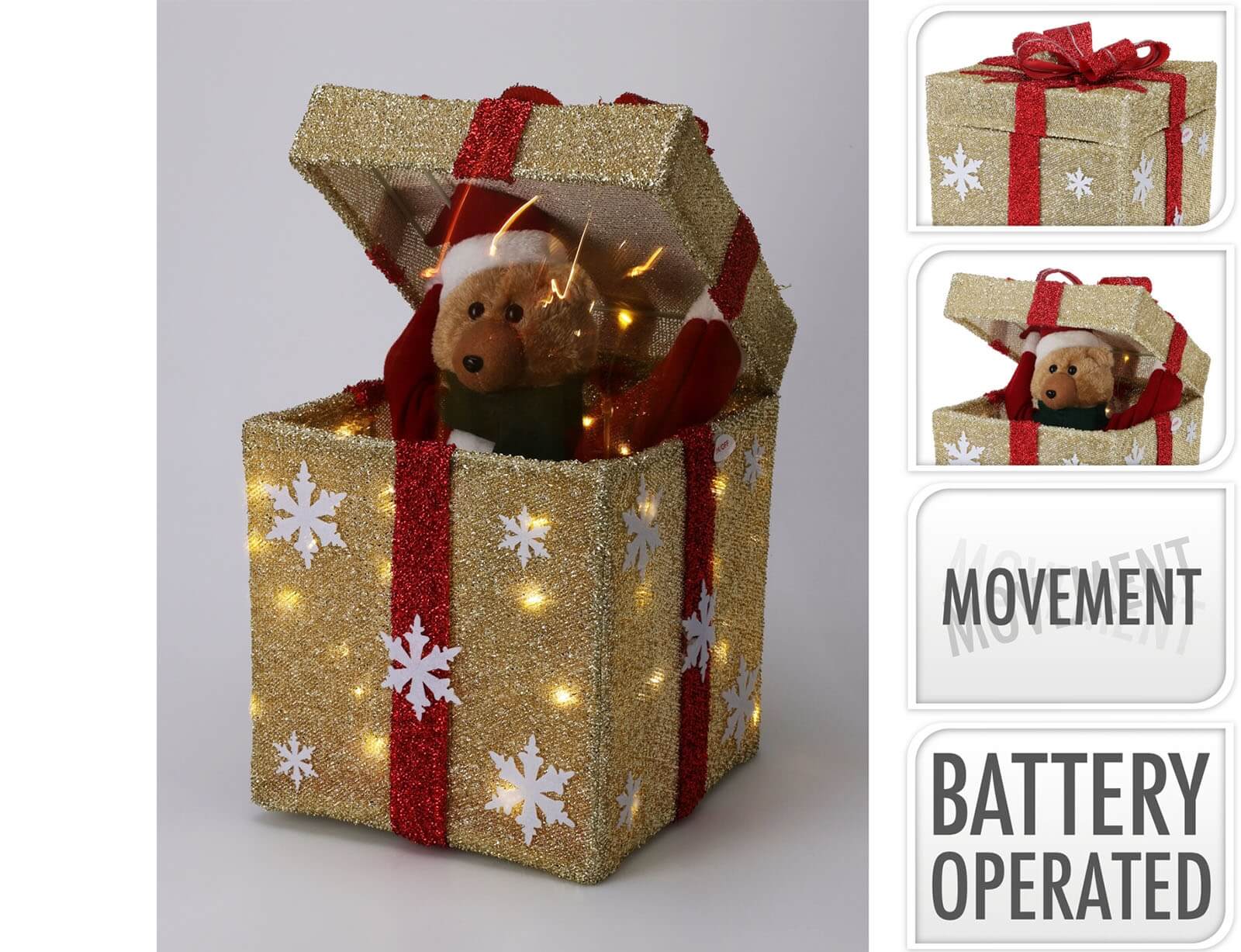 Ένα μοναδικό χριστουγεννιάτικο διακοσμητικό που θα γεμίσει τον χώρο σας με μαγεία και γιορτινή θαλπωρή! Πρόκειται για ένα εντυπωσιακό κουτί-δώρο σε χρυσή απόχρωση, διακοσμημένο με λαμπερή κόκκινη κορδέλα και λευκές νιφάδες χιονιού, που δίνει την αίσθηση ενός πραγματικού χριστουγεννιάτικου δώρου κάτω από το δέντρο. Στο εσωτερικό του κρύβεται ένα χαριτωμένο αρκουδάκι με σκούφο Άγιου Βασίλη, το οποίο εμφανίζεται παιχνιδιάρικα καθώς το καπάκι ανοίγει και κλείνει, δημιουργώντας μια ζωντανή και χαρούμενη κίνηση που τραβά τα βλέμματα.
