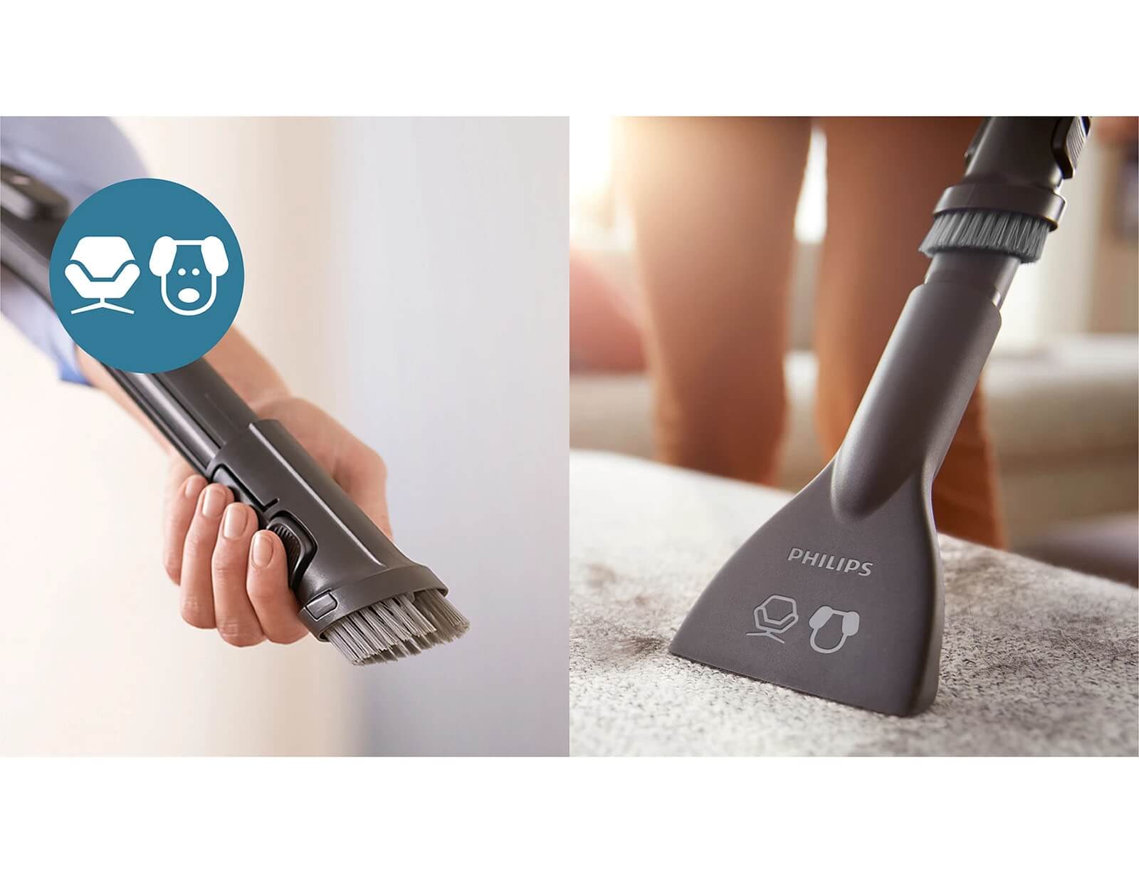 Μπορείτε να χρησιμοποιείτε την ενσωματωμένη βούρτσα καθαρισμού που βρίσκεται στη λαβή για να αφαιρέσετε τη σκόνη ανά πάσα στιγμή από έπιπλα, επίπεδες επιφάνειες και ταπετσαρίες.