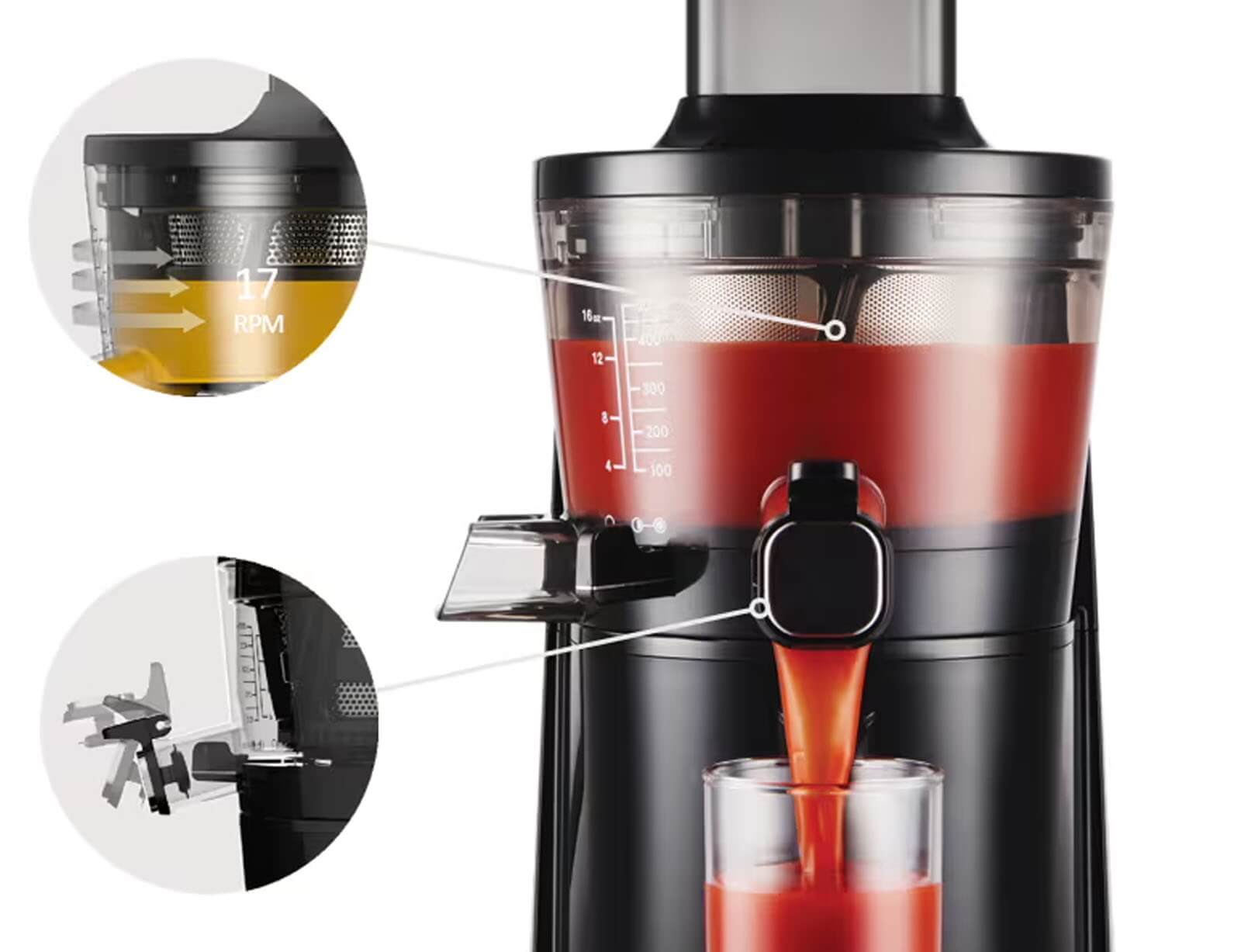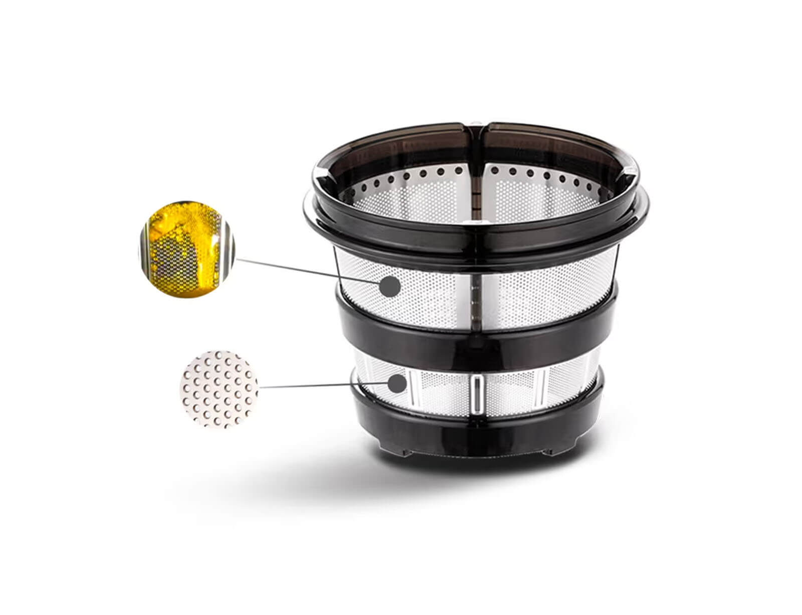 Οι 6.612 λεπτές διατρήσεις έχουν μια δομή που αυξάνεται από μέσα προς τα έξω του πλέγματος, βοηθώντας στην ομαλή εκκένωση του αδιάλυτου διαλύματος. Επίσης, διαχωρίζει τα περιττά απόβλητα και κάνει τον χυμό απαλό στην κατανάλωση.