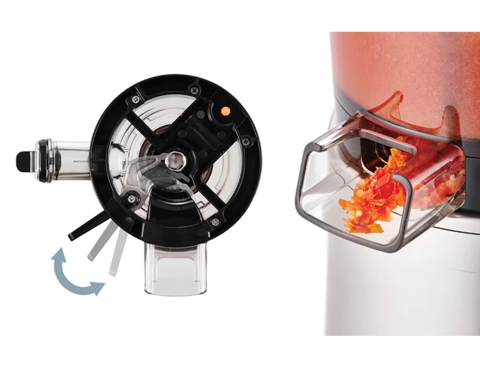 Ανάλογα με τη σκληρότητα και την απαλότητα του υλικού, η πίεση για την αποβολή των υπολειμμάτων μπορεί να ρυθμιστεί, γεγονός που βοηθά στην καλή εξαγωγή του χυμού και διευκολύνει την αποβολή των υπολειμμάτων κατά την παρασκευή του χυμού.