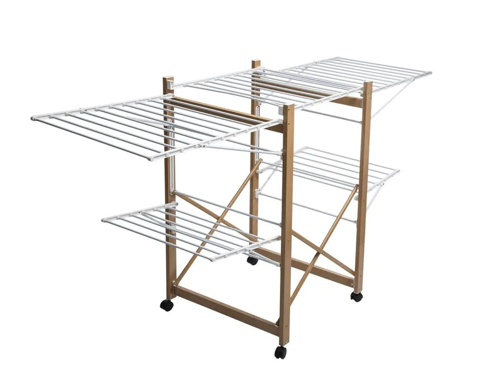 Πτυσσόμενη απλώστρα δαπέδου από την εταιρεία 5five. Με συνολικό μήκος απλώματος 27 μέτρα, χωράει τα ρούχα, τις πετσέτες ή τα σεντόνια σας. Είναι κατασκευασμένη από ανθεκτικό μεταλλικό υλικό σε μαύρο χρώμα και διπλώνει ώστε να αποθηκεύεται εύκολα όταν δεν την χρησιμοποιείτε για εξοικονόμηση χώρου. Διαθέτει μεγάλους σωλήνες που δεν αφήνουν σημάδια στα ρούχα και μειώνουν τον χρόνο στεγνώματος. Χάρη στους 4 τροχούς μετακινείται εύκολα σε οποιονδήποτε χώρο, ενώ είναι κατάλληλη για χρήση τόσο σε εσωτερικό όσο και σε εξωτερικό χώρο.