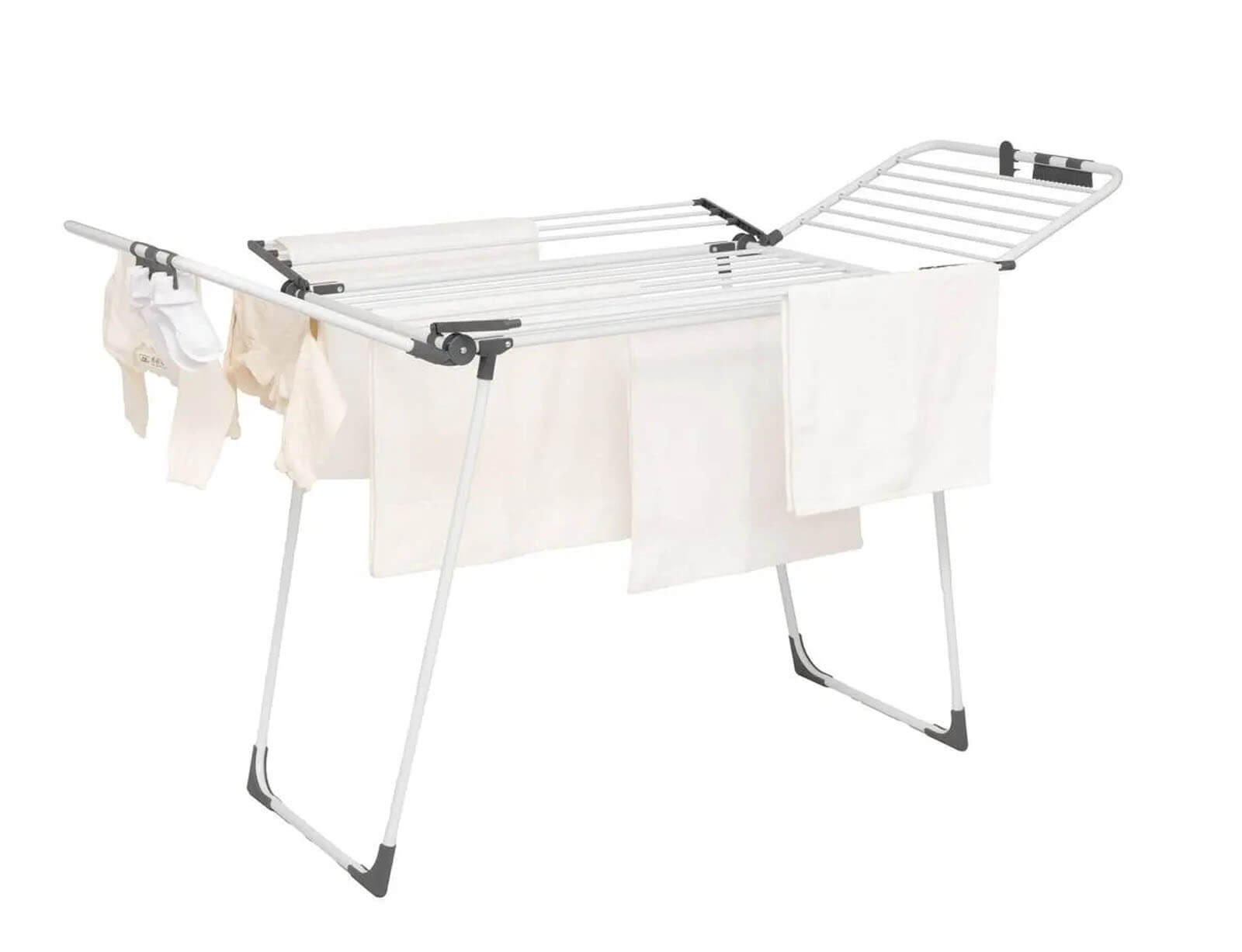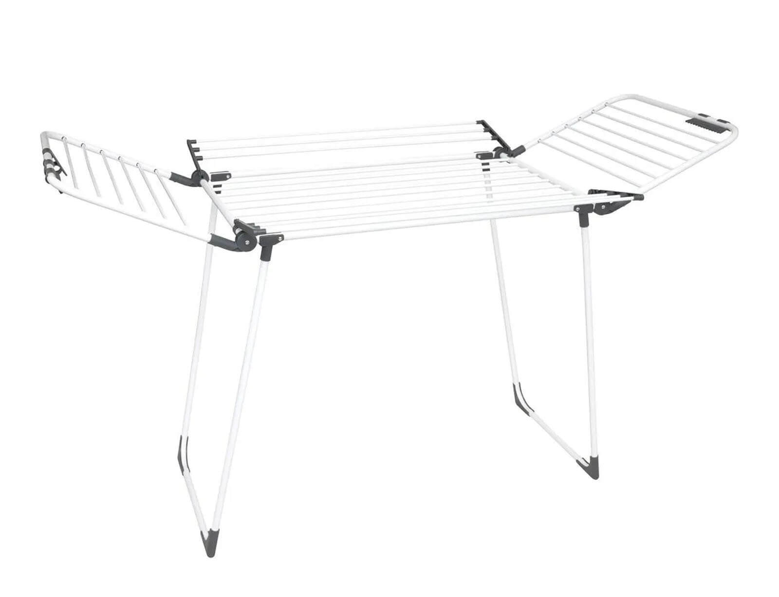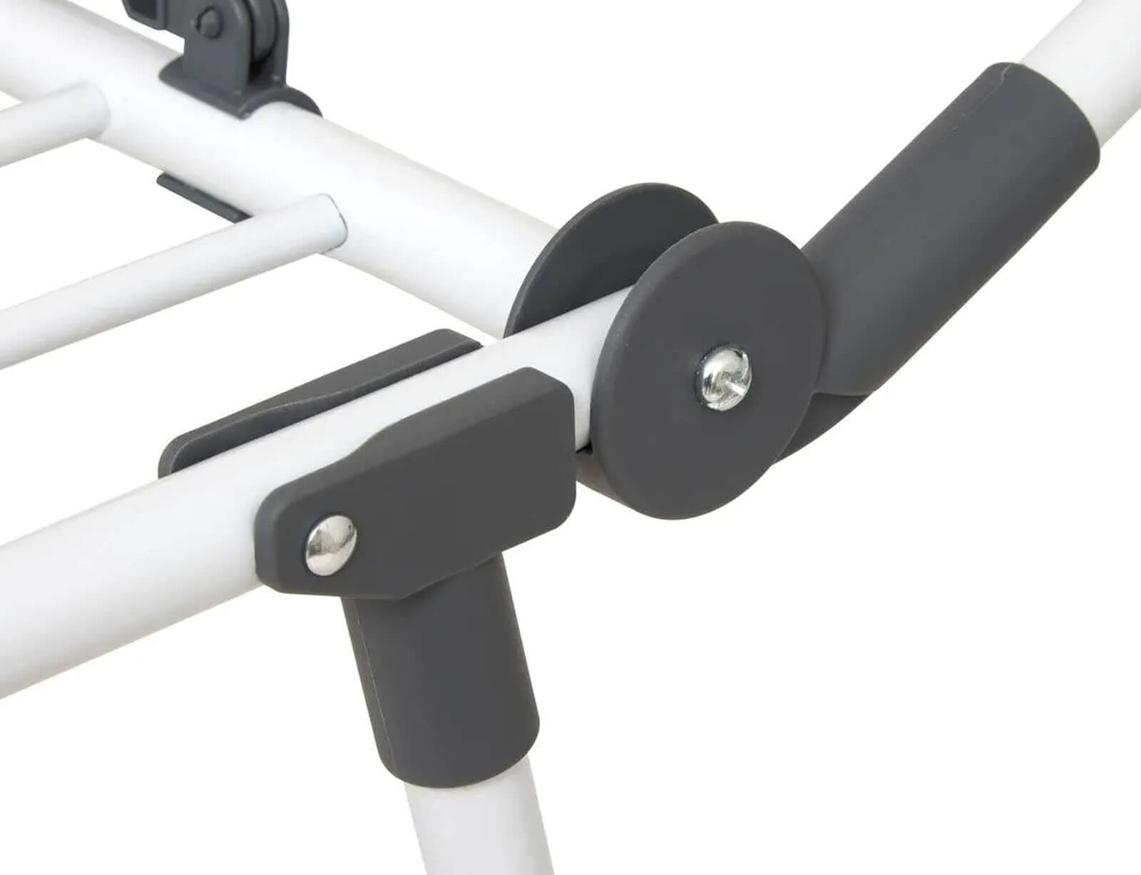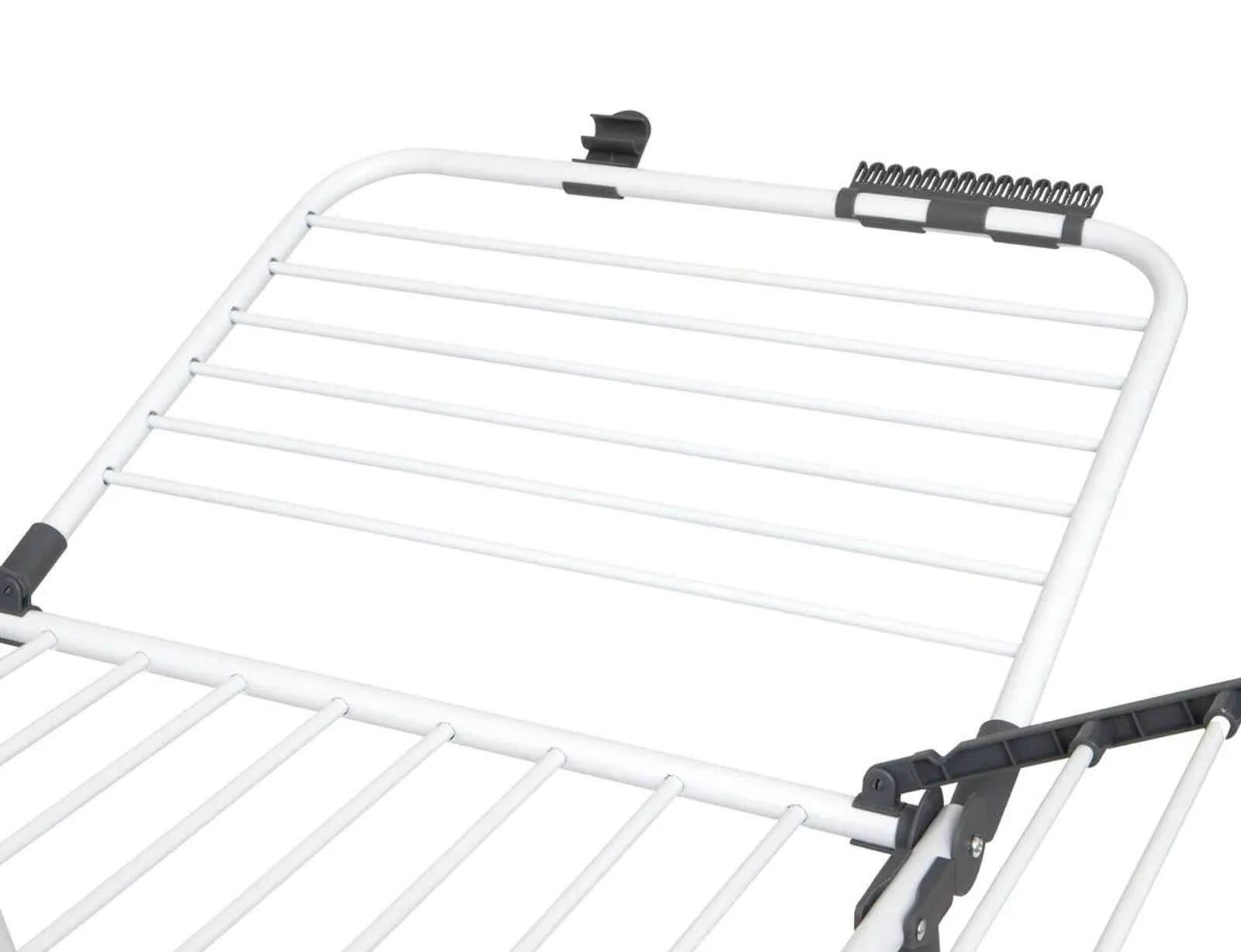 Πτυσσόμενη απλώστρα δαπέδου από την εταιρεία 5five. Με συνολικό μήκος απλώματος 25 μέτρα, χωράει τα ρούχα, τις πετσέτες ή τα σεντόνια σας. Είναι κατασκευασμένη από ανθεκτικό μεταλλικό υλικό σε λευκόχρώμα και διπλώνει ώστε να αποθηκεύεται εύκολα όταν δεν την χρησιμοποιείτε για εξοικονόμηση χώρου. Διαθέτει 2 αποσπώμενα φτερά που επιτρέπουν το άνετο άπλωμα μεγάλων ποσοτήτων ρούχων. Τα φαρδιά σύρματα της σειράς Sinai αποτρέπουν τα σημάδια στο ύφασμα και μειώνουν τον χρόνο στεγνώματος, ενώ τα ενσωματωμένα αξεσουάρ για εσώρουχα προσφέρουν πρακτικότητα στην καθημερινή χρήση.