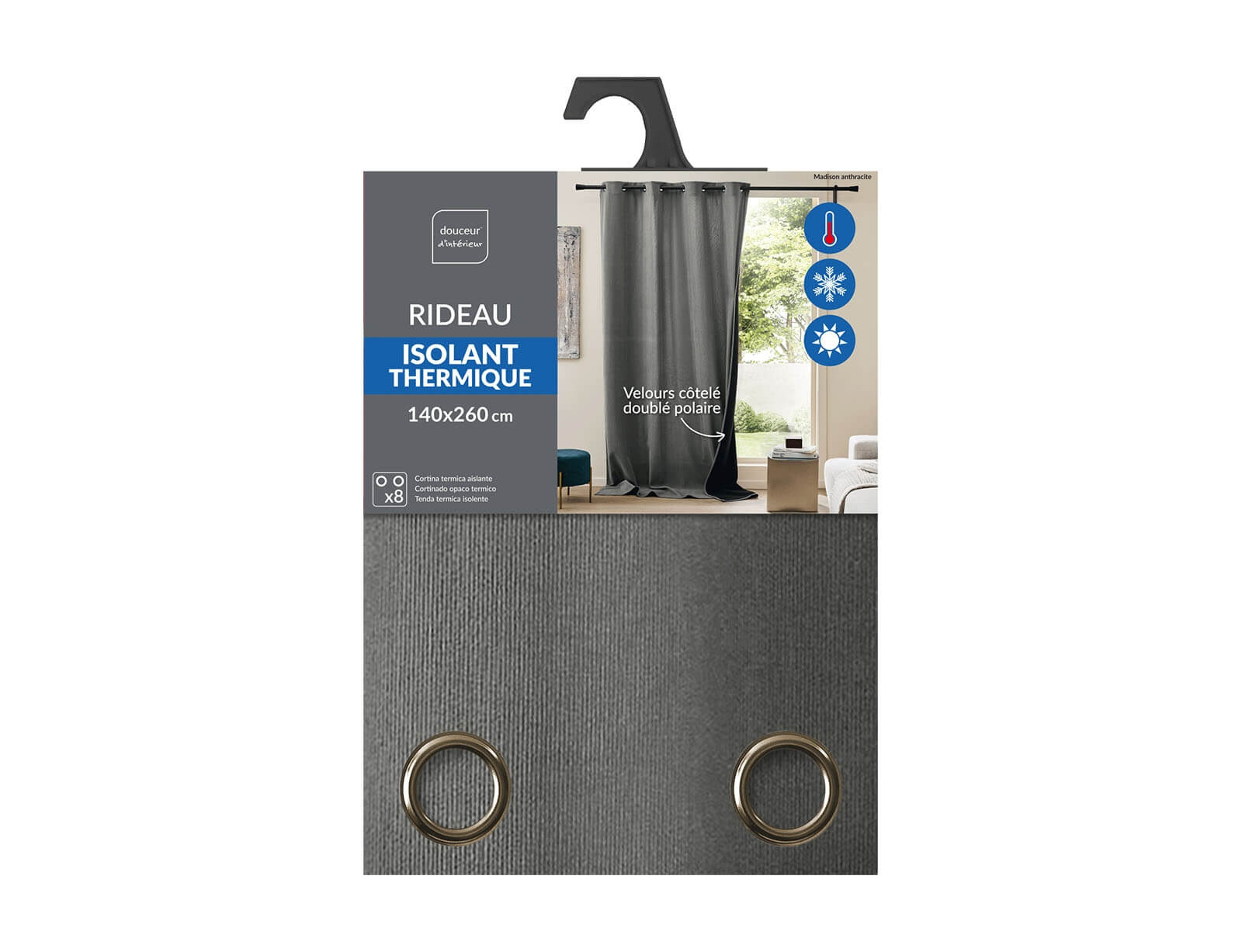 Θερμομονωτική Κουρτίνα Υψηλής Σκίασης Madison Douceur d'intérieur με τρουκς και διαστάσεις 140x260cm - Anthracite