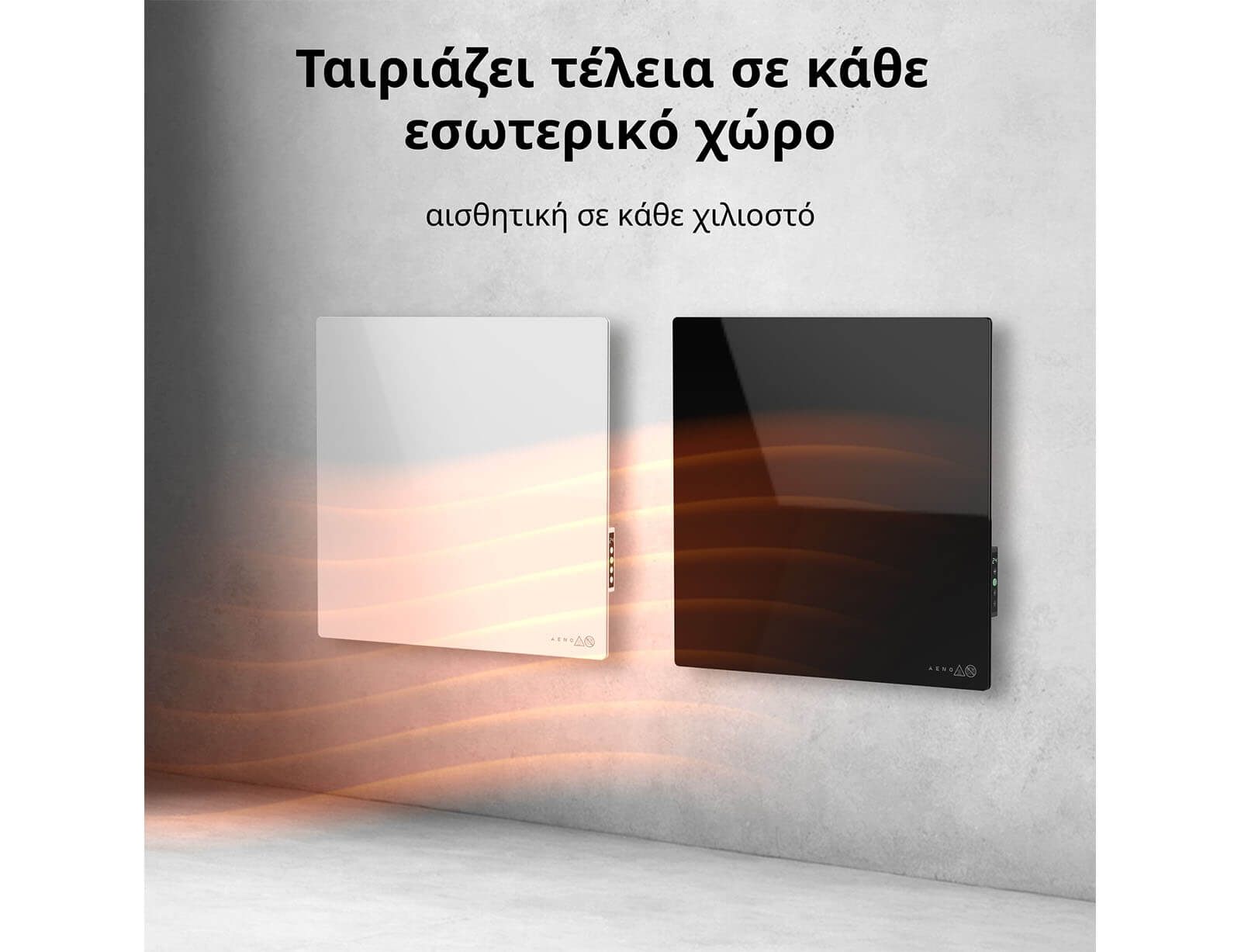 Η επιτοίχια θερμάστρα AENO Premium ECO Smart Quadro σε κομψά χρώματα - μαύρο μαργαριταρένιο ή γυαλιστερό λευκό - ταιριάζει απόλυτα σε κάθε χώρο.