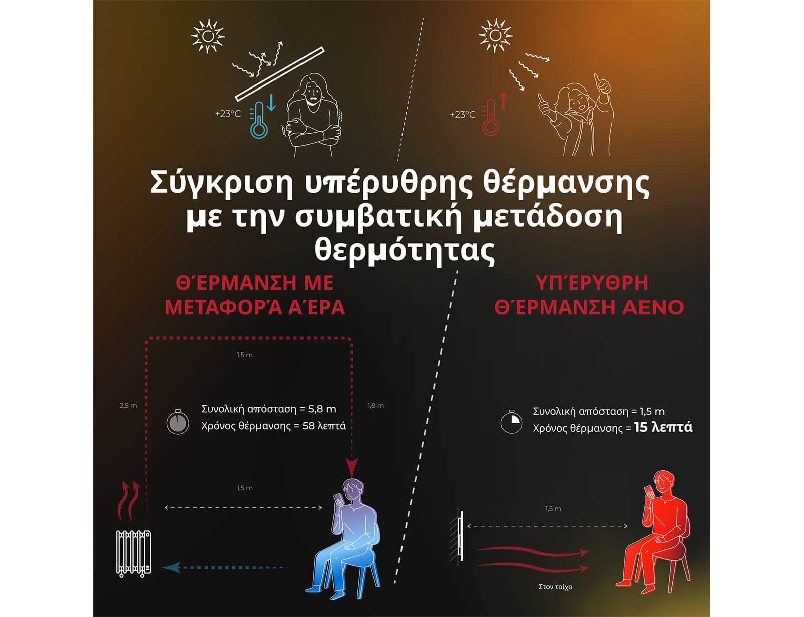 Η υπέρυθρη θέρμανση παρέχει απαλή θερμότητα που δεν ξηραίνει τον αέρα, δεν καίει οξυγόνο ή δεν απελευθερώνει επιβλαβείς ουσίες στον χώρο διαβίωσής σας.
