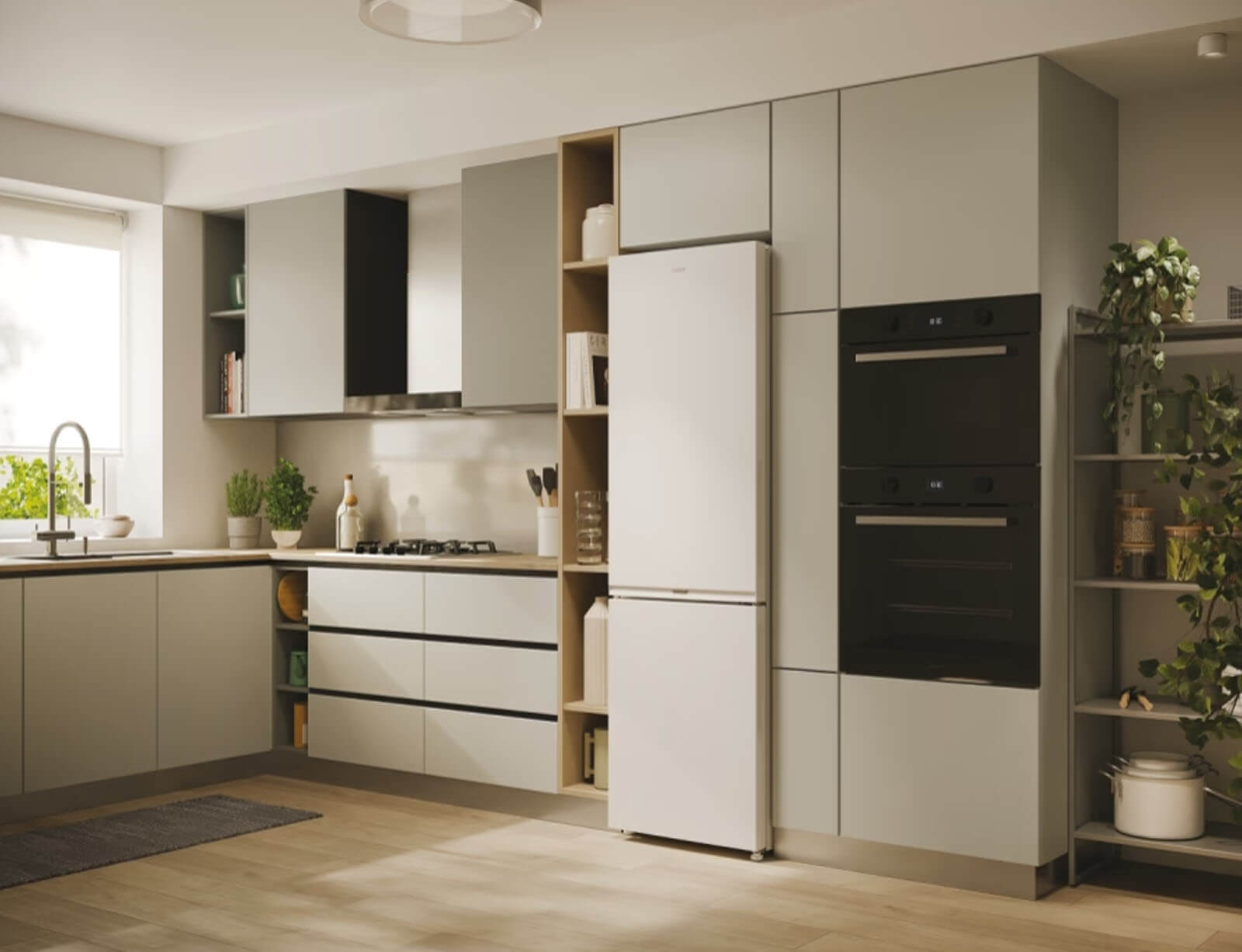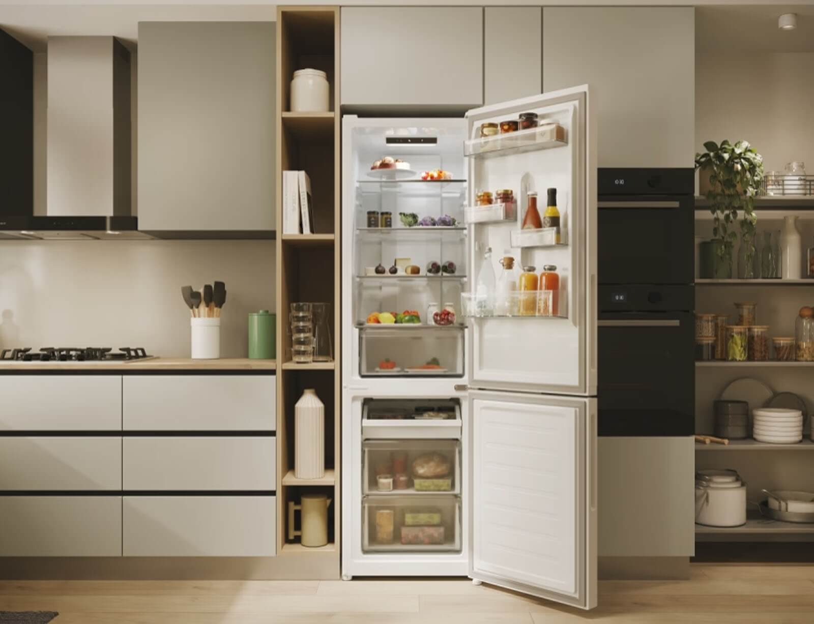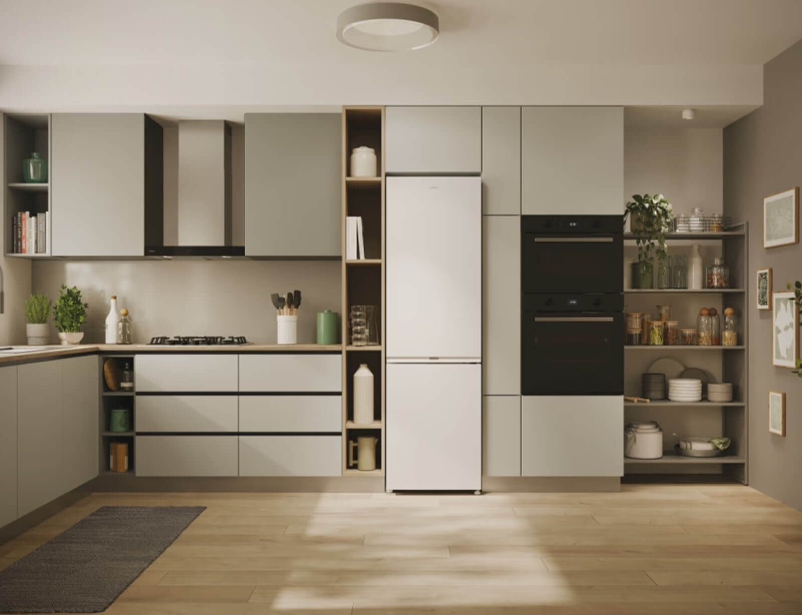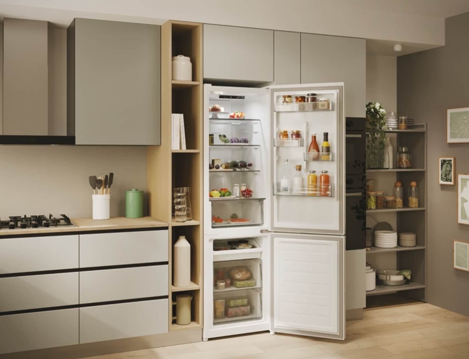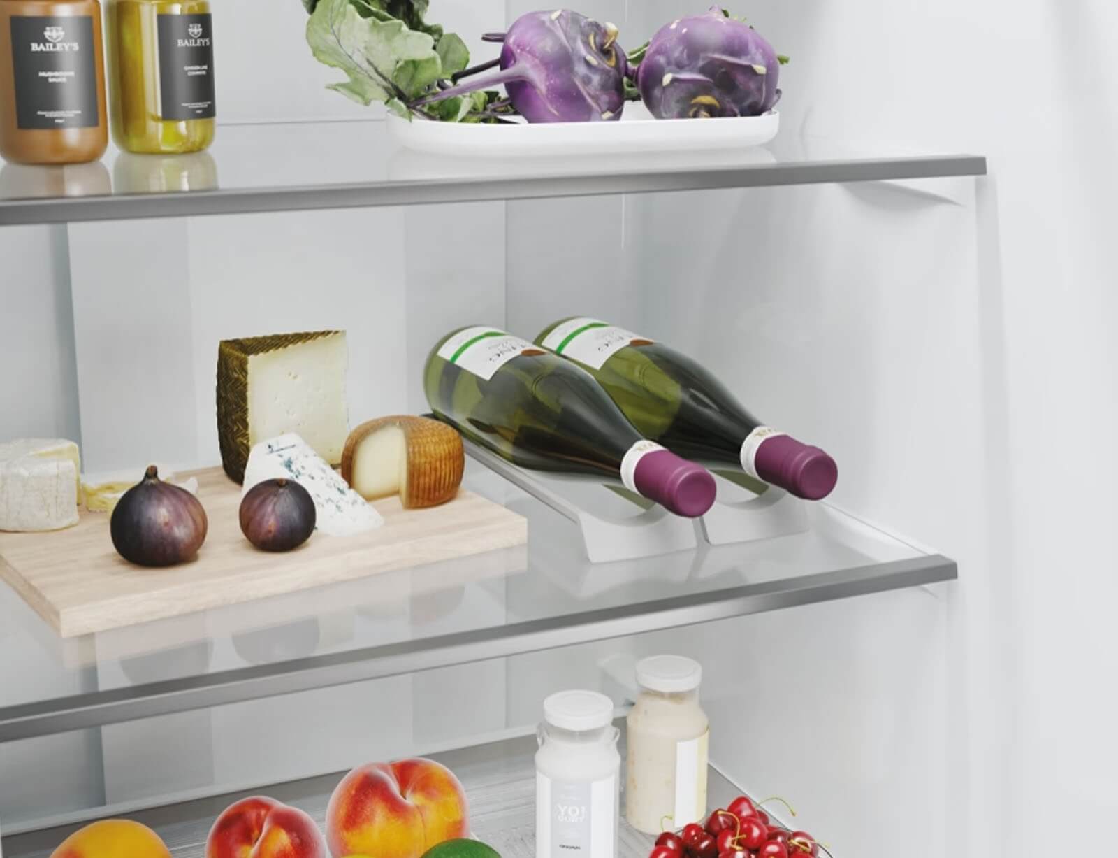 Το ψυγείο ενσωματώνεται τέλεια με το σχεδιασμό της κουζίνας σας: η λαβή και ο ιμάντας της πόρτας ταιριάζουν άψογα με τον πάγκο της κουζίνας, ενώ οι κρυφοί μεντεσέδες επιτρέπουν την ευέλικτη τοποθέτηση με άνοιγμα πόρτας 90°.