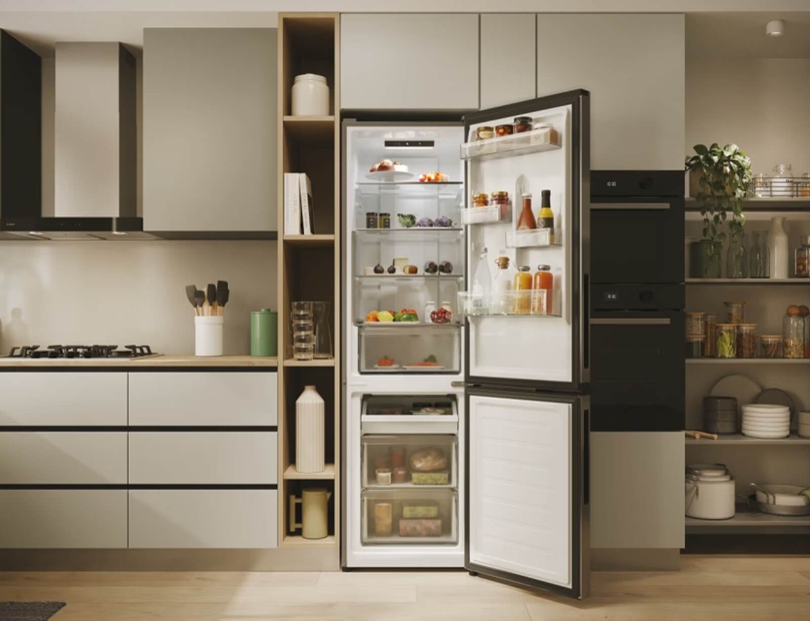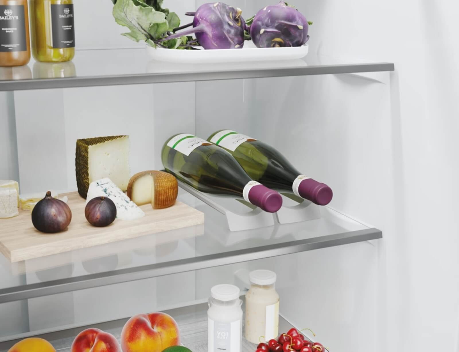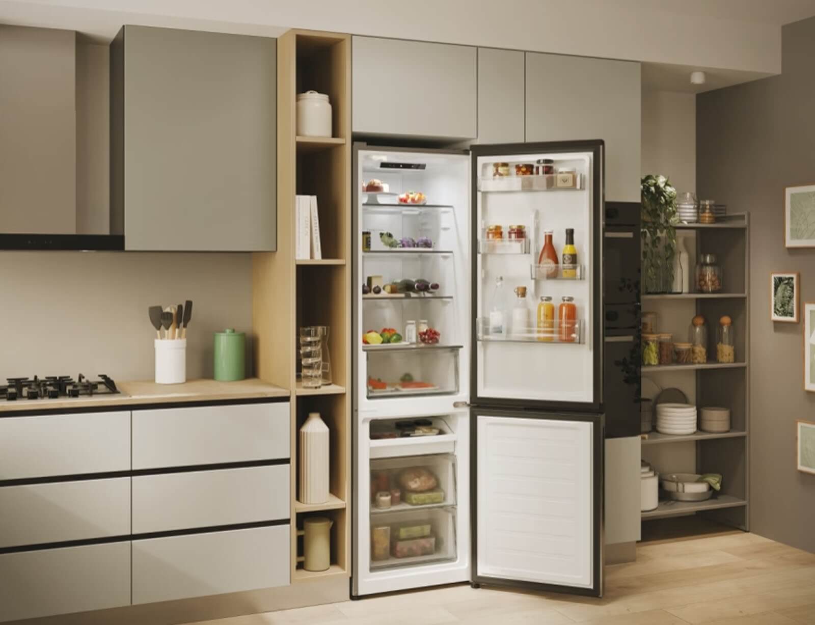 Το ψυγείο ενσωματώνεται τέλεια με το σχεδιασμό της κουζίνας σας: η λαβή και ο ιμάντας της πόρτας ταιριάζουν άψογα με τον πάγκο της κουζίνας, ενώ οι κρυφοί μεντεσέδες επιτρέπουν την ευέλικτη τοποθέτηση με άνοιγμα πόρτας 90°.