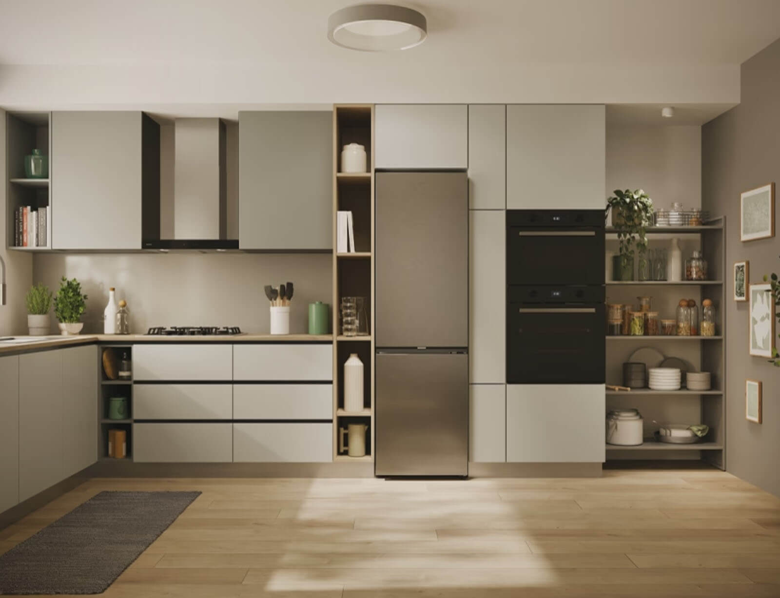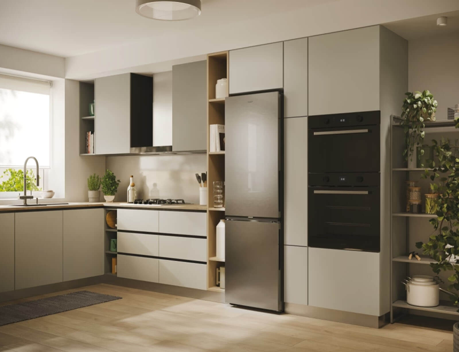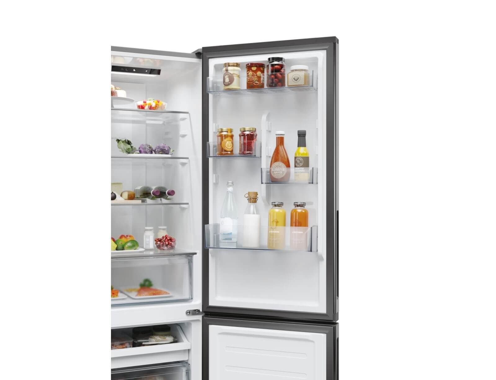 Το ψυγείο ενσωματώνεται τέλεια με το σχεδιασμό της κουζίνας σας: η λαβή και ο ιμάντας της πόρτας ταιριάζουν άψογα με τον πάγκο της κουζίνας, ενώ οι κρυφοί μεντεσέδες επιτρέπουν την ευέλικτη τοποθέτηση με άνοιγμα πόρτας 90°.