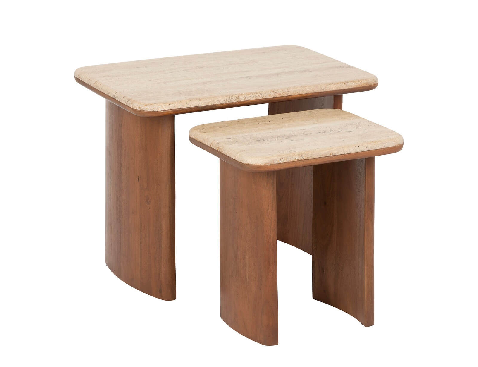 Το σετ τραπεζάκια Jivan συνδυάζει τη φυσική αρμονία των υλικών με τον εκλεπτυσμένο σχεδιασμό, δημιουργώντας ένα κομμάτι που αποπνέει αυθεντικότητα, ισορροπία και διακριτική πολυτέλεια. Κατασκευασμένο από μασίφ ξύλο ακακίας και επιφάνεια από φυσικό τραβερτίνη, το Jivan αποτελεί μια ιδανική επιλογή για όσους εκτιμούν τη φυσική ομορφιά και τη διαχρονική ποιότητα. Η πέτρινη επιφάνεια από τραβερτίνη εντυπωσιάζει με τη μοναδική της υφή και τις απαλές γήινες αποχρώσεις της. Η βάση από ξύλο ακακίας συμπληρώνει ιδανικά τη φυσική πέτρα, προσφέροντας σταθερότητα, ζεστασιά και αισθητική ισορροπία. Το ξύλο ακακίας, γνωστό για τη σκληρότητα και τα όμορφα νερά του, φέρνει έναν οργανικό, γήινο τόνο που αναδεικνύει τη φυσικότητα του συνόλου. Ο συνδυασμός των δύο υλικών δημιουργεί μια αισθητική αντίθεση ανάμεσα στη στιβαρότητα της πέτρας και τη θερμή απαλότητα του ξύλου.
