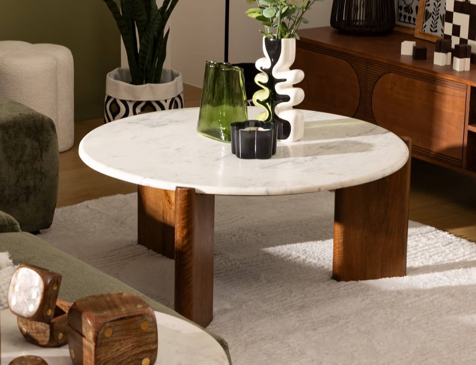 Το τραπεζάκι Nanda από την Atmosphera αποτελεί μια εξαιρετική πρόταση για όσους αναζητούν ένα κομψό και διαχρονικό κομμάτι που θα αναδείξει το σαλόνι τους. Ο εκλεπτυσμένος σχεδιασμός του συνδυάζει την αυθεντική ομορφιά των φυσικών υλικών με τη σύγχρονη αισθητική, δημιουργώντας ένα αποτέλεσμα που αποπνέει ζεστασιά, ισορροπία και στυλ. Η επιφάνειά του από φυσικό μάρμαρο χαρίζει μια αίσθηση πολυτέλειας και φινέτσας, ενώ οι μοναδικές νεράδες του κάθε κομματιού προσθέτουν χαρακτήρα και μοναδικότητα. Η σταθερή βάση από μασίφ ξύλο mango συμπληρώνει άψογα την εικόνα, προσδίδοντας γήινες αποχρώσεις και φυσική υφή που ζεσταίνουν τον χώρο.