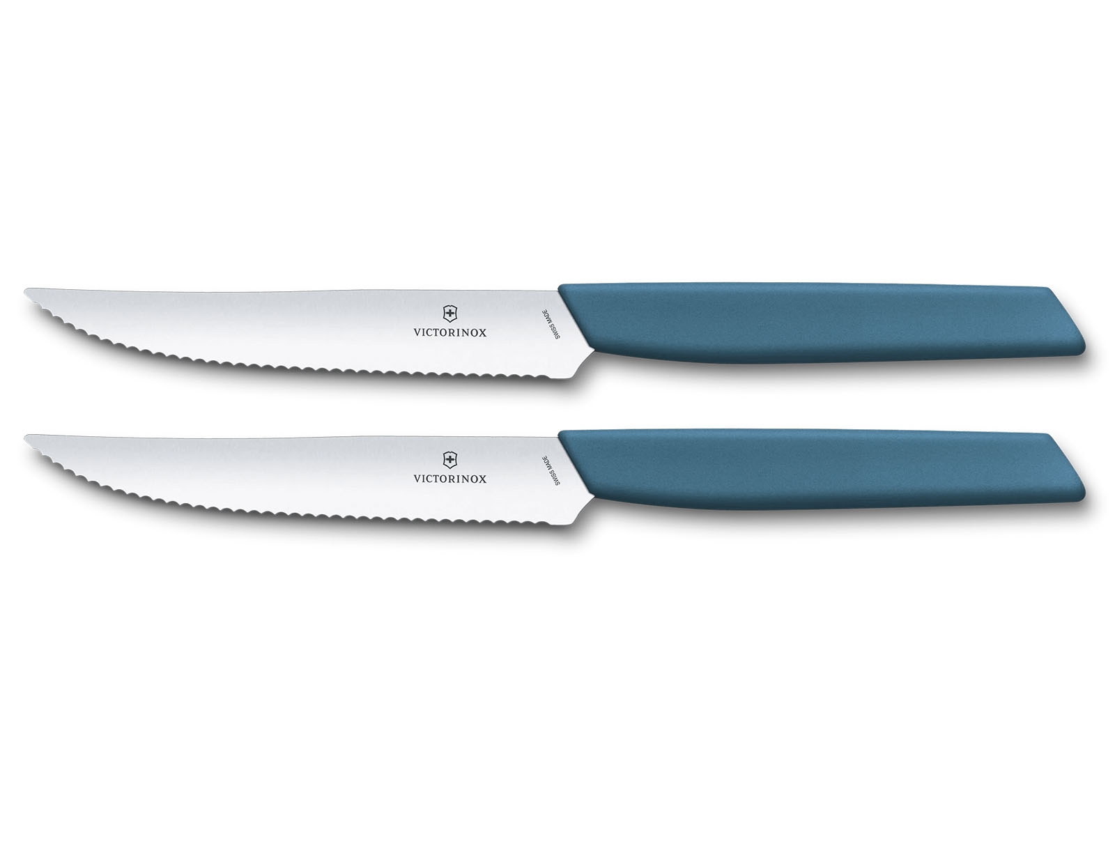 Αν γνωρίζετε το T-bone σας από το rib eye, θα ξέρετε πόσο σημαντικό είναι ένα καλό μαχαίρι για μπριζόλα. Για μια κοφτερή λεπίδα που γλιστράει μέσα από το κρέας και μια άνετη λαβή για εύκολο κόψιμο, ρίξτε μια ματιά στο σετ μαχαιριών μπριζόλας Swiss Modern, 2 τεμαχίων. Με μοντέρνα, κομψή εμφάνιση και άψογη λειτουργικότητα, αυτό το λαμπερό σετ είναι ο τέλειος συνδυασμός για φαγητό.