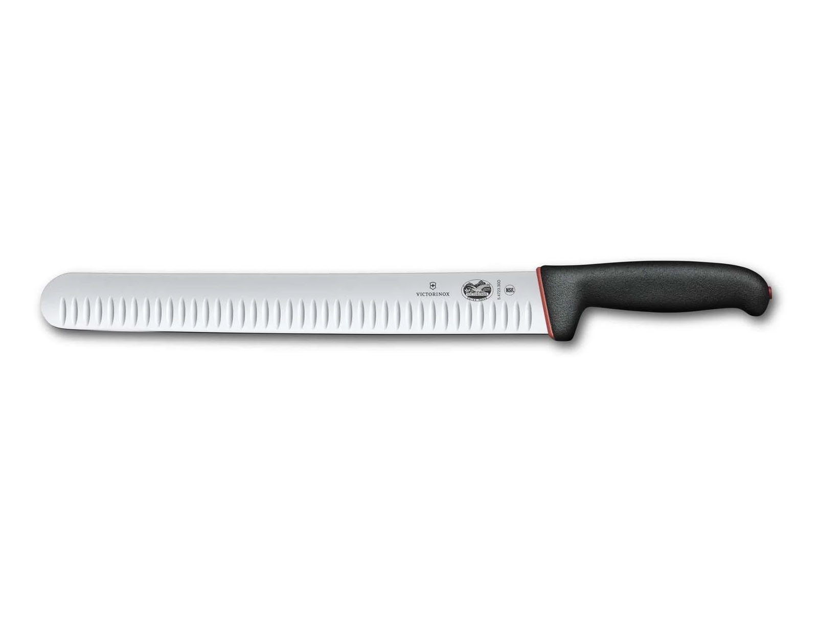 To μαχαίρι τεμαχισμού είναι ιδανικό για να κόβετε μεγάλα κομμάτια από κρέας, όπως ψητά ή αλλαντικά σε λεπτές φέτες. Η λεπτή του λάμα σε συνδυασμό με το χαμηλό της πλάτος, σας δίνει καλύτερη ακρίβεια στο κόψιμο, ενώ το μήκος του εξασφαλίζει ότι θα μπορείτε να κόβετε ακόμα και μεγάλες φέτες εύκολα και με ακρίβεια με μια μόνο κίνηση. Η σειρά Dual Grip της Victorinox συνδυάζει ελβετική ακρίβεια με εργονομικό σχεδιασμό, προσφέροντας επαγγελματικά μαχαίρια με εξαιρετική κοπή και άνεση στη χρήση. Οι λαβές δύο συστατικών (πολυπροπυλένιο εσωτερικά και θερμοπλαστικό ελαστομερές εξωτερικά) είναι αντιολισθητικές, ανθεκτικές στο νερό και στο λίπος, εργονομικά σχεδιασμένες και εξαιρετικά ανθεκτικές σε υψηλές θερμοκρασίες (μέχρι 110°C), επιτρέποντας αποστείρωση και πλύσιμο στο πλυντήριο πιάτων.