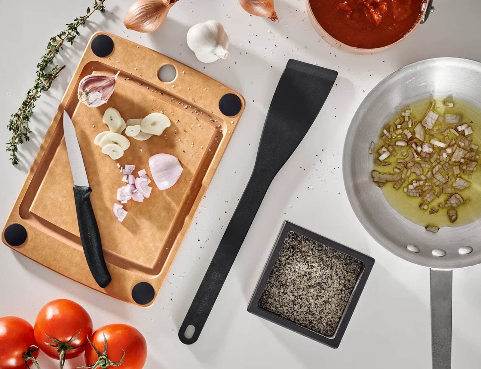 Το υλικό των επιφανειών κoπής της Victorinox αποτελείται από φύλλα χαρτιού, που μαζί με την ρητίνη πιέζονται για να σχηματίσουν ένα σύνθετο υλικό με βάση το χαρτί (65% χαρτί, 35% ρητίνη) δεν είναι πορώδες και είναι εξαιρετικά ανθεκτικό στη βαφή. Επίσης, δεν περιέχει μέταλλα ή πτητικές & ημι-πτητικές οργανικές ουσίες. H Victorinox σας παρέχει επιφάνειες κοπής εξαιρετικής ποιότητας, ασφαλείς, ανθεκτικές και με σεβασμό στα μαχαίρια σας αλλά και στο περιβάλλον.
