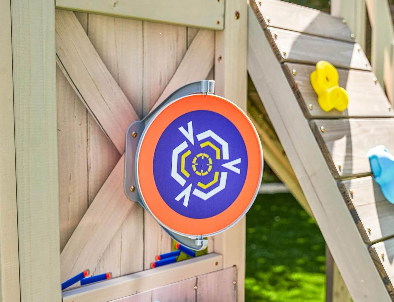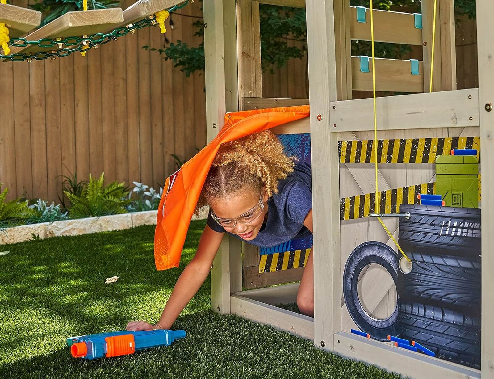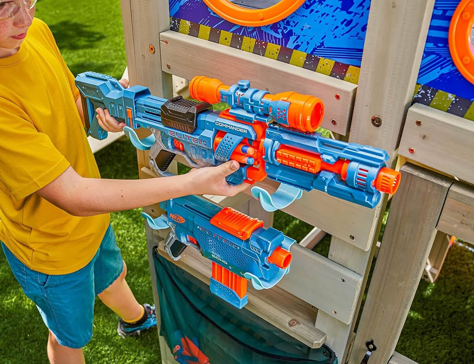 Στο εσωτερικό θα βρείτε ειδικό χώρο αποθήκευσης για blasters, σημείο προετοιμασίας για μάχες και μυστική είσοδο μέσω τούνελ ερπυσμού. Οι περιστρεφόμενοι στόχοι προσφέρουν εξάσκηση στη σκοποβολή, ενώ παιχνίδια όπως το Capture the Flag κάνουν το παιχνίδι ακόμη πιο συναρπαστικό. Πρόκειται για μια στιβαρή, ανθεκτική κατασκευή που υπόσχεται ατελείωτη διασκέδαση στον εξωτερικό χώρο. Δεν επιτρέπεται η χρήση νεροπίστολων.