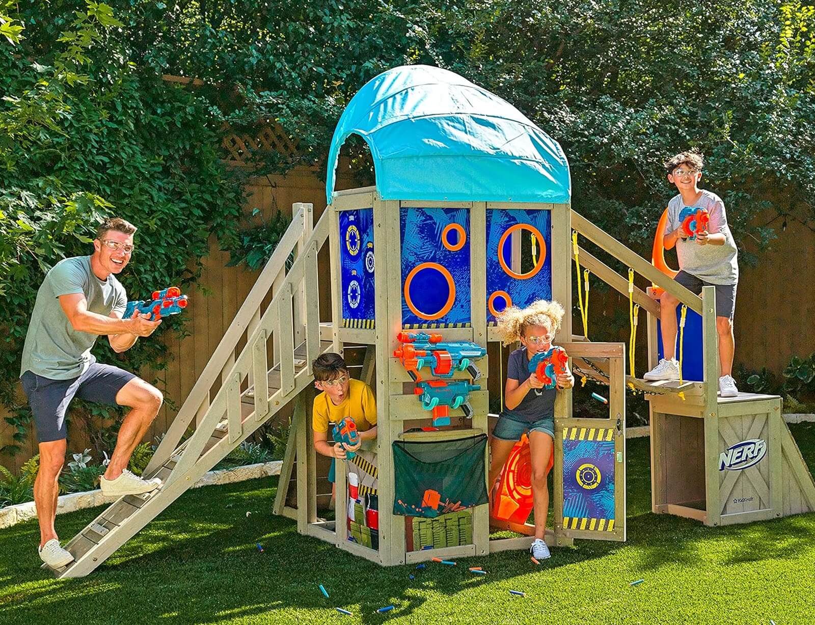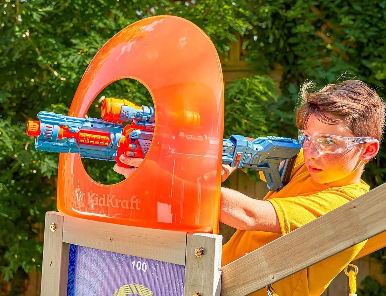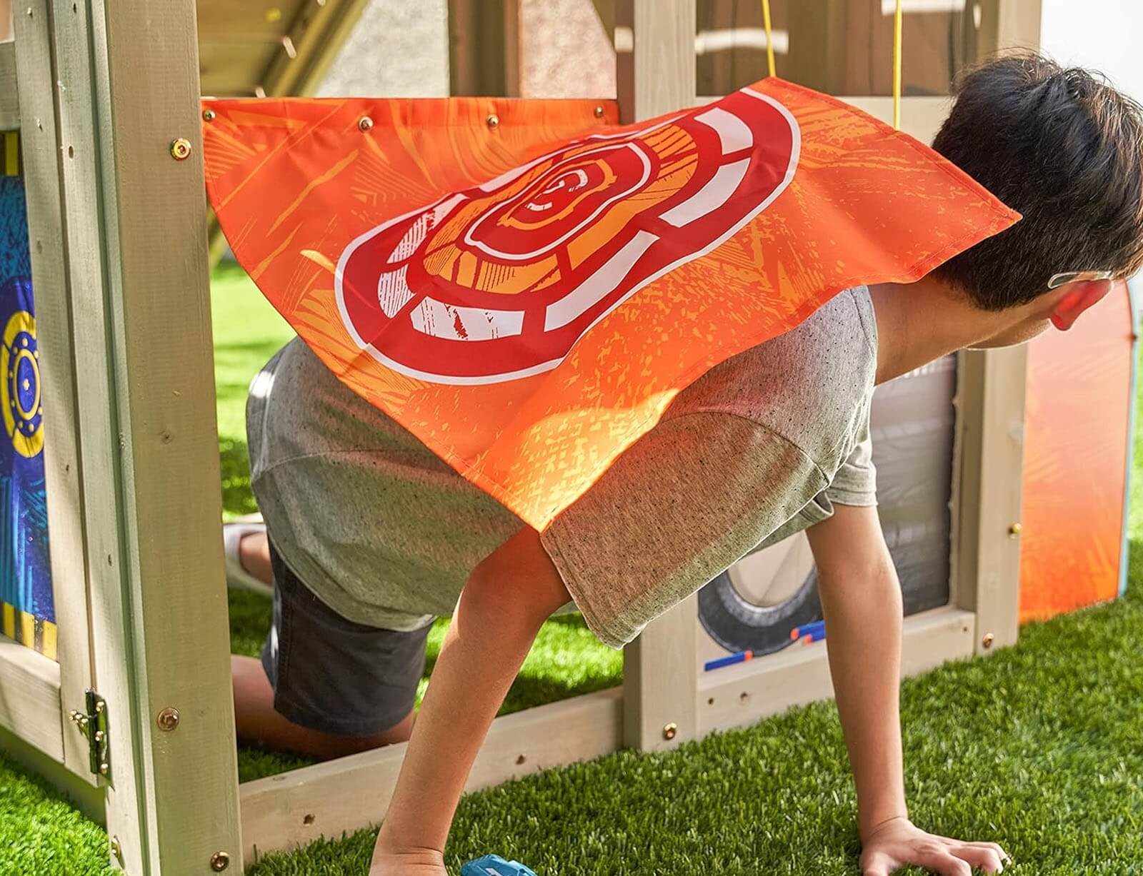 Στο εσωτερικό θα βρείτε ειδικό χώρο αποθήκευσης για blasters, σημείο προετοιμασίας για μάχες και μυστική είσοδο μέσω τούνελ ερπυσμού. Οι περιστρεφόμενοι στόχοι προσφέρουν εξάσκηση στη σκοποβολή, ενώ παιχνίδια όπως το Capture the Flag κάνουν το παιχνίδι ακόμη πιο συναρπαστικό. Πρόκειται για μια στιβαρή, ανθεκτική κατασκευή που υπόσχεται ατελείωτη διασκέδαση στον εξωτερικό χώρο. Δεν επιτρέπεται η χρήση νεροπίστολων.