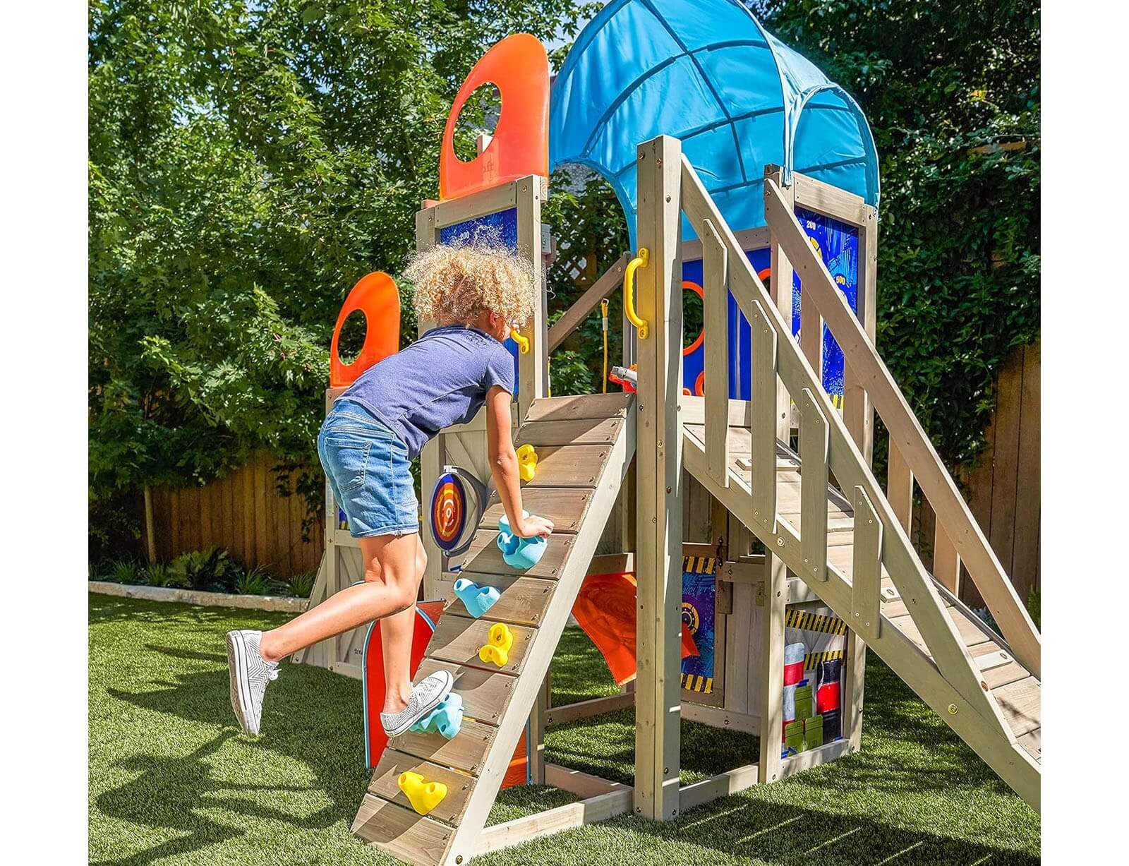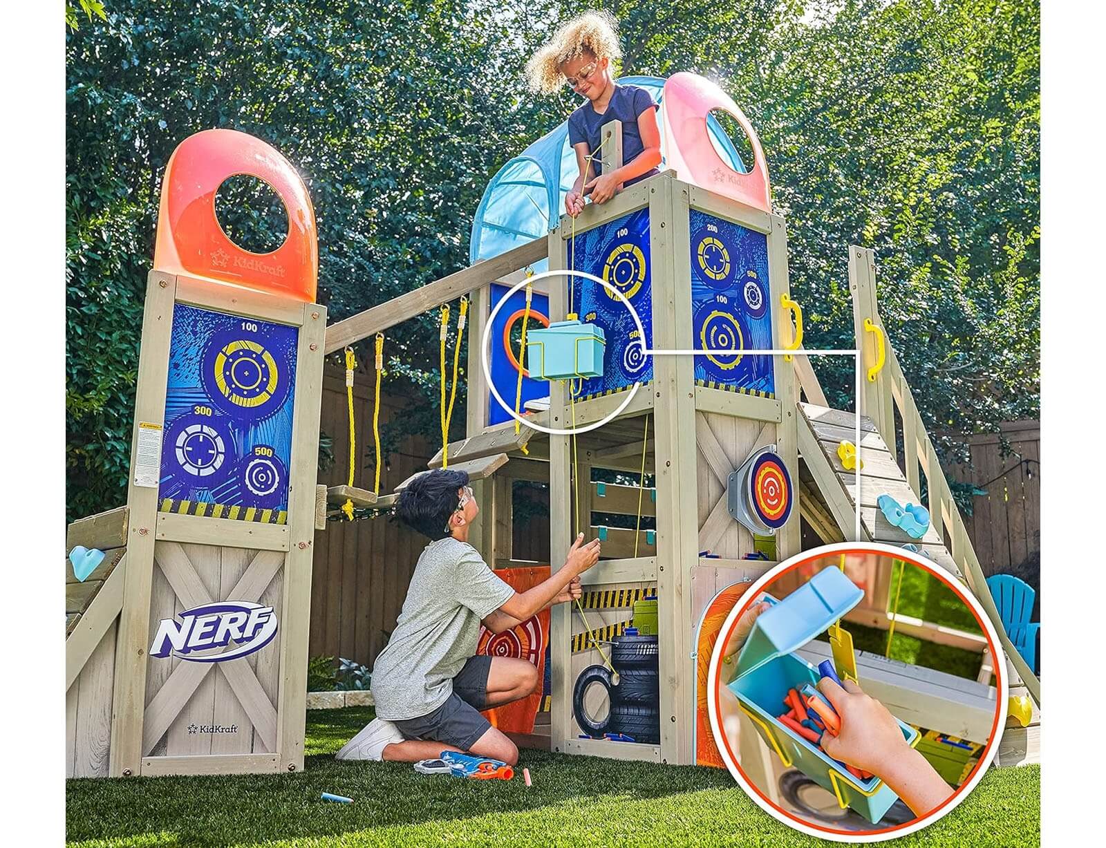 Η KidKraft Nerf Command Base είναι το απόλυτο οχυρό δράσης για μικρούς λάτρεις των blaster μαχών. Με εντυπωσιακές διαστάσεις 4.45x1.84x2.61m, προσφέρει άφθονο χώρο για παιχνίδι και αμέτρητες δυνατότητες περιπέτειας. Τα παιδιά μπορούν να σκαρφαλώσουν σε γέφυρες και σκάλες, να κινηθούν σε υπερυψωμένα περάσματα, να πάρουν θέση στο καλύτερο σημείο εποπτείας ή να ξεφύγουν γρήγορα μέσα από την καταπακτή διαφυγής. Ο μηχανισμός με κασέλα πυρομαχικών επιτρέπει την εύκολη μεταφορά «προμηθειών» από το ένα επίπεδο στο άλλο, ενισχύοντας την ατμόσφαιρα πραγματικής αποστολής.