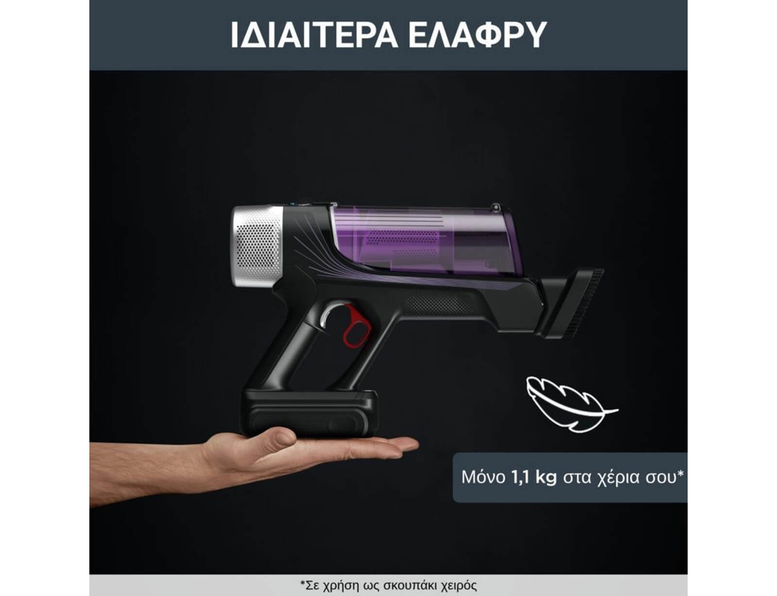 Μια ασύρματη ηλεκτρική σκούπα με συμπαγή σχεδιασμό, με βάρος μόνο 1,1 kg σε λειτουργία χειρός, για να κάνει τις συνεδρίες καθαρισμού ευκολότερες, ελαφρύτερες και πιο άνετες μέρα με τη μέρα.
