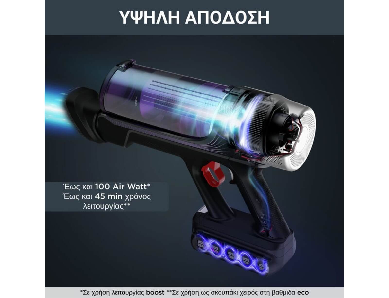 Εξοπλισμένο με ισχυρή, σταθερή ισχύ αναρρόφησης έως και 100 airwatt* για μέγιστη απόδοση μέρα με τη μέρα και μπαταρία μεγάλης διάρκειας με έως και 45 λεπτά χρόνο λειτουργίας** για έντονη απόδοση καθαρισμού.