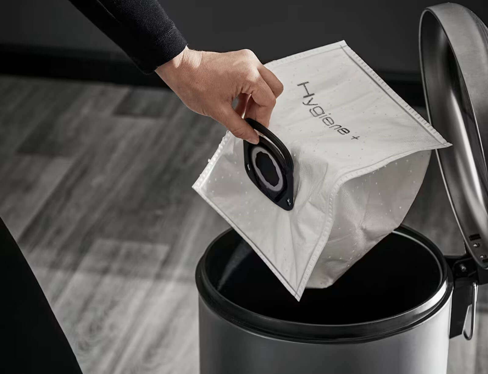 Σχεδιασμένη για να εγγυάται άνεση και ευκολία χρήσης, η τσάντα Hygiene+ προσφέρει ένα πιο υγιεινό σύστημα αντικατάστασης σακούλας που αποφεύγει οποιαδήποτε επαφή με τη σκόνη.