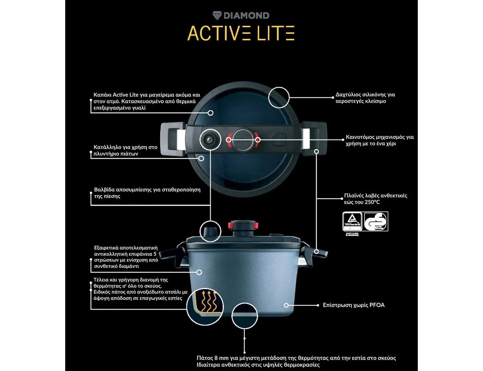 Με τον ειδικό σχεδιασμό Diamond Active Lite, το νερό μέσα στη χύτρα θερμαίνεται μόλις πάνω από 100 ° C. Αυτό παράγει μια μικρή ποσότητα υπερπίεσης στην κατσαρόλα, μειώνοντας σημαντικά το χρόνο βρασμού / μαγειρέματος με παρόμοιο τρόπο με μια χύτρα ταχύτητας. Οι χρόνοι μαγειρέματος, εξαρτώνται από πολλούς παράγοντες, όπως το πλήθος των συστατικών και η ισχύς της εστίας.