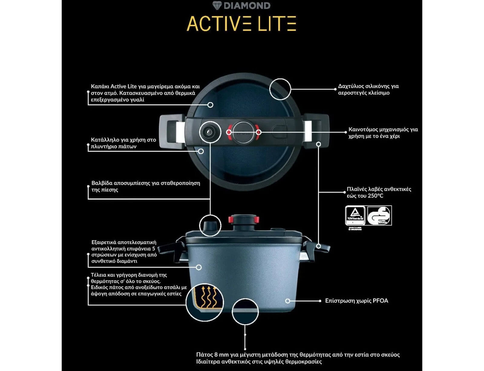 Με τον ειδικό σχεδιασμό Diamond Active Lite, το νερό μέσα στη χύτρα θερμαίνεται μόλις πάνω από 100 ° C. Αυτό παράγει μια μικρή ποσότητα υπερπίεσης στην κατσαρόλα, μειώνοντας σημαντικά το χρόνο βρασμού / μαγειρέματος με παρόμοιο τρόπο με μια χύτρα ταχύτητας. Οι χρόνοι μαγειρέματος, εξαρτώνται από πολλούς παράγοντες, όπως το πλήθος των συστατικών και η ισχύς της εστίας.