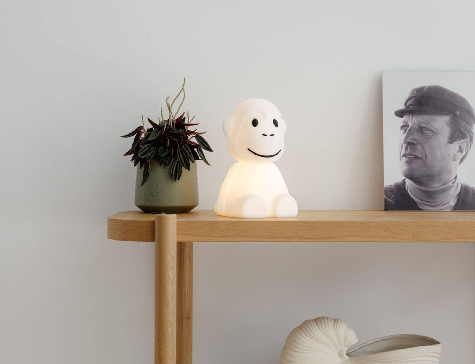 Φωτίστε τα όνειρα του μικρού σας φίλου με μια φιλική μαϊμού! Το απαλό, ζεστό φως της και ο γαλήνιος σχεδιασμός της δημιουργούν μια ζεστή και χαλαρωτική ατμόσφαιρα για την ώρα του ύπνου. Το φωτιστικό είναι κατασκευασμένο από μαλακή, ασφαλή για παιδιά σιλικόνη, που προσφέρει ευχάριστη υφή και προστατεύει το προϊόν από πιθανά χτυπήματα ή πτώσεις. Όταν ανάβει, ολόκληρη η φιγούρα φωτίζεται με ένα όμορφο, ομοιόμορφο φως.