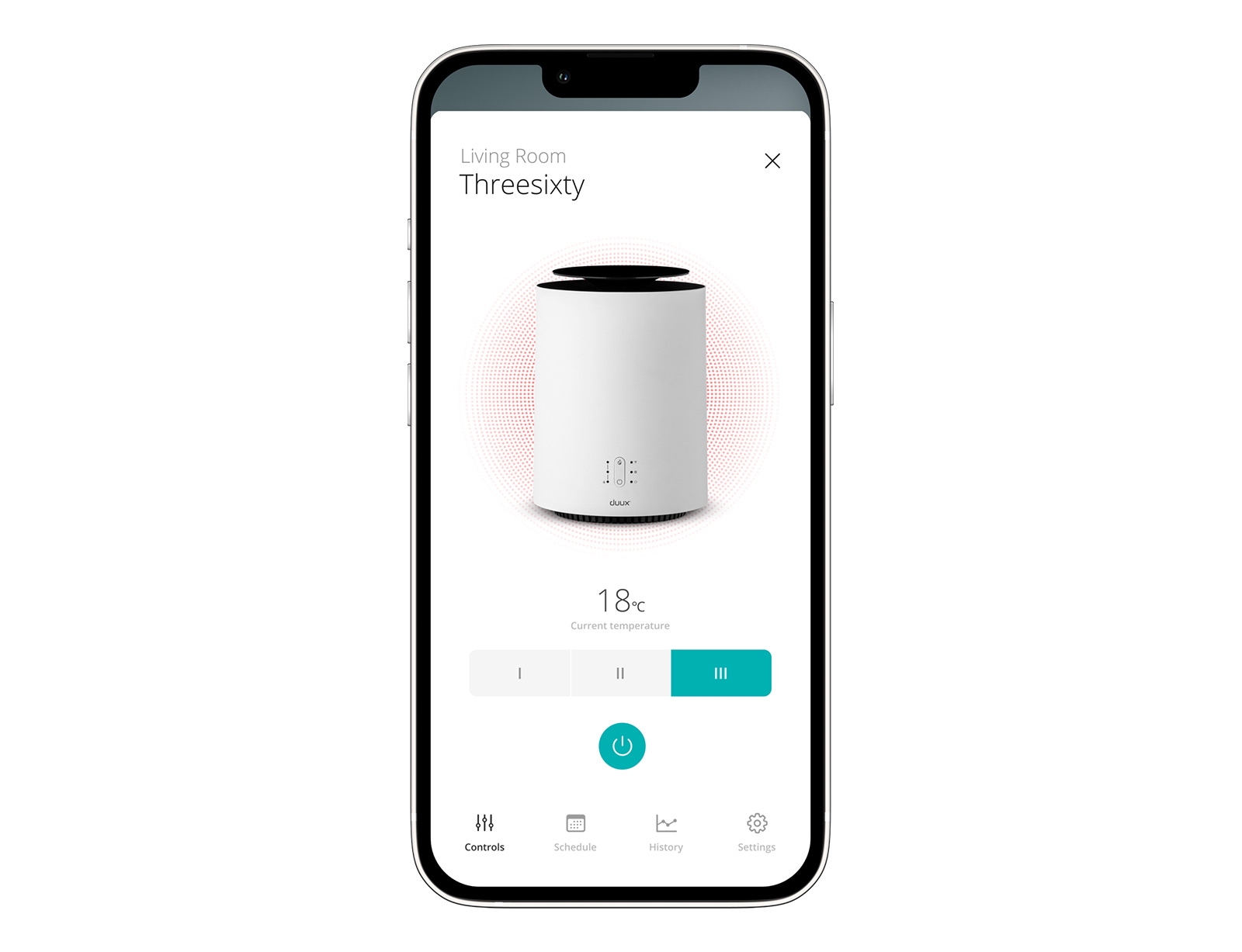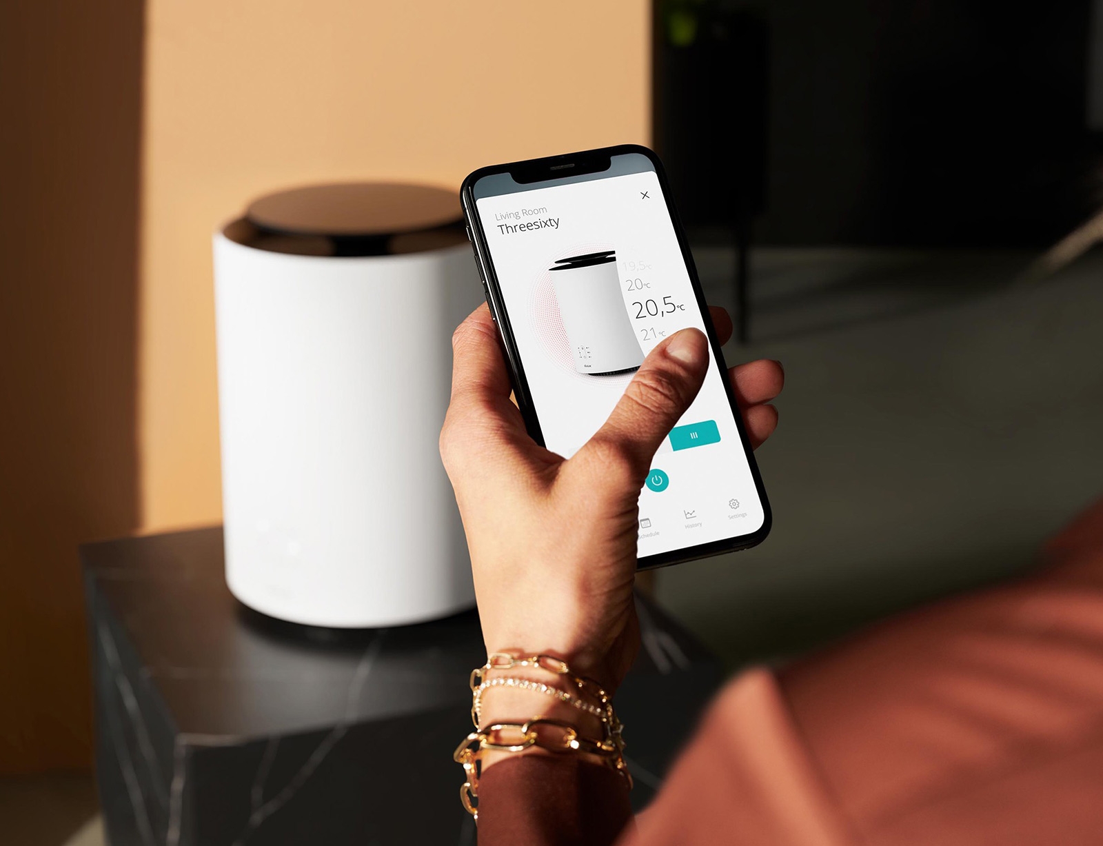 Ο χειρισμός είναι εύκολος: χρησιμοποιήστε τα κουμπιά της συσκευής ή κατεβάστε την εφαρμογή για να ελέγχετε το Threesixty 2 από την αγαπημένη σας καρέκλα. Με την εφαρμογή είναι δυνατή η ρύθμιση της θερμοκρασίας μεταξύ 18-30°C. Η ενδεικτική λυχνία LED της σόμπας δείχνει ποιες ρυθμίσεις είναι ενεργές.