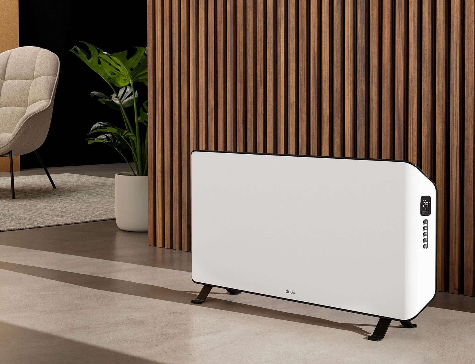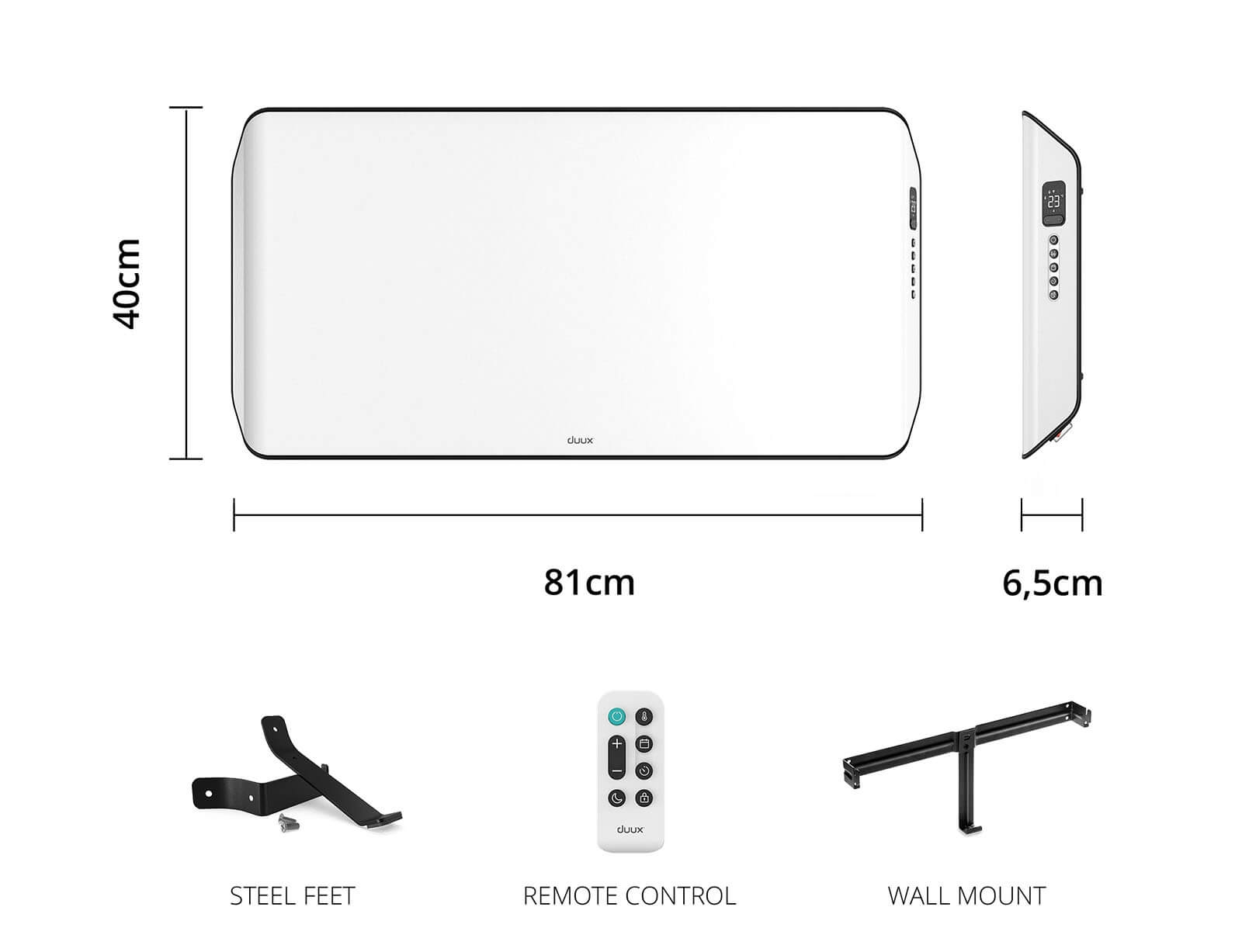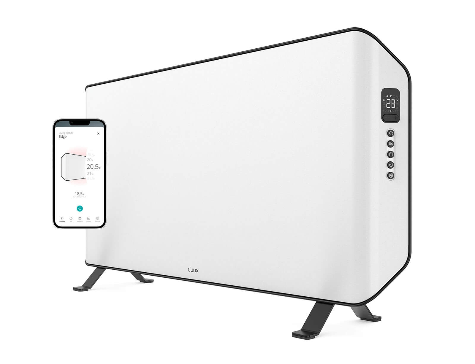 - Εύκολη ρύθμιση μέσω της οθόνης LED, του τηλεχειριστηρίου ή της Duux.