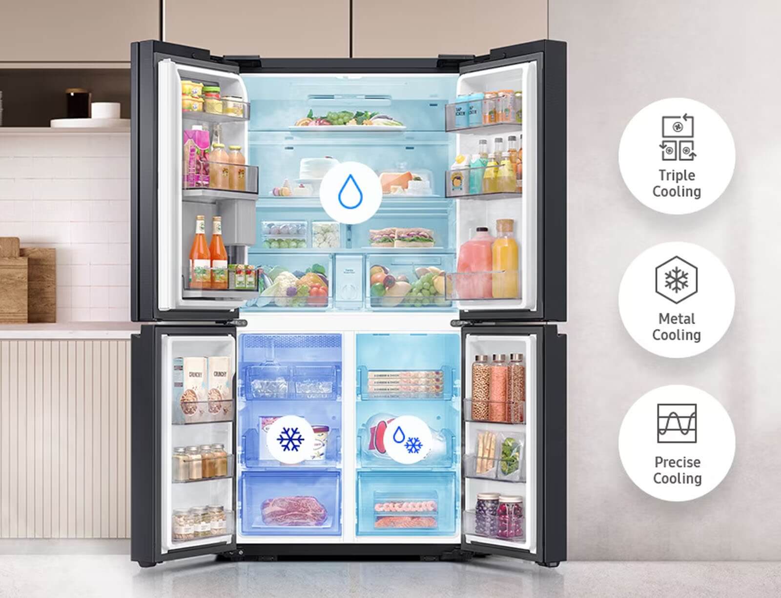 Κρατήστε τα τρόφιμα σας φρέσκα για μεγάλο χρονικό διάστημα και διατηρήστε το άρωμα και τη γεύση τους. Το Triple Cooling ρυθμίζει ανεξάρτητα τη θερμοκρασία και την υγρασία στους 3 χώρους και προλαμβάνει την ανάμειξη των οσμών. Το Precise Cooling ρυθμίζει επίσης κάθε διακύμανση θερμοκρασίας ενώ η μεταλλική πλάκα Metal Cooling βοηθάει στο να διατηρείται κρύο το ψυγείο.