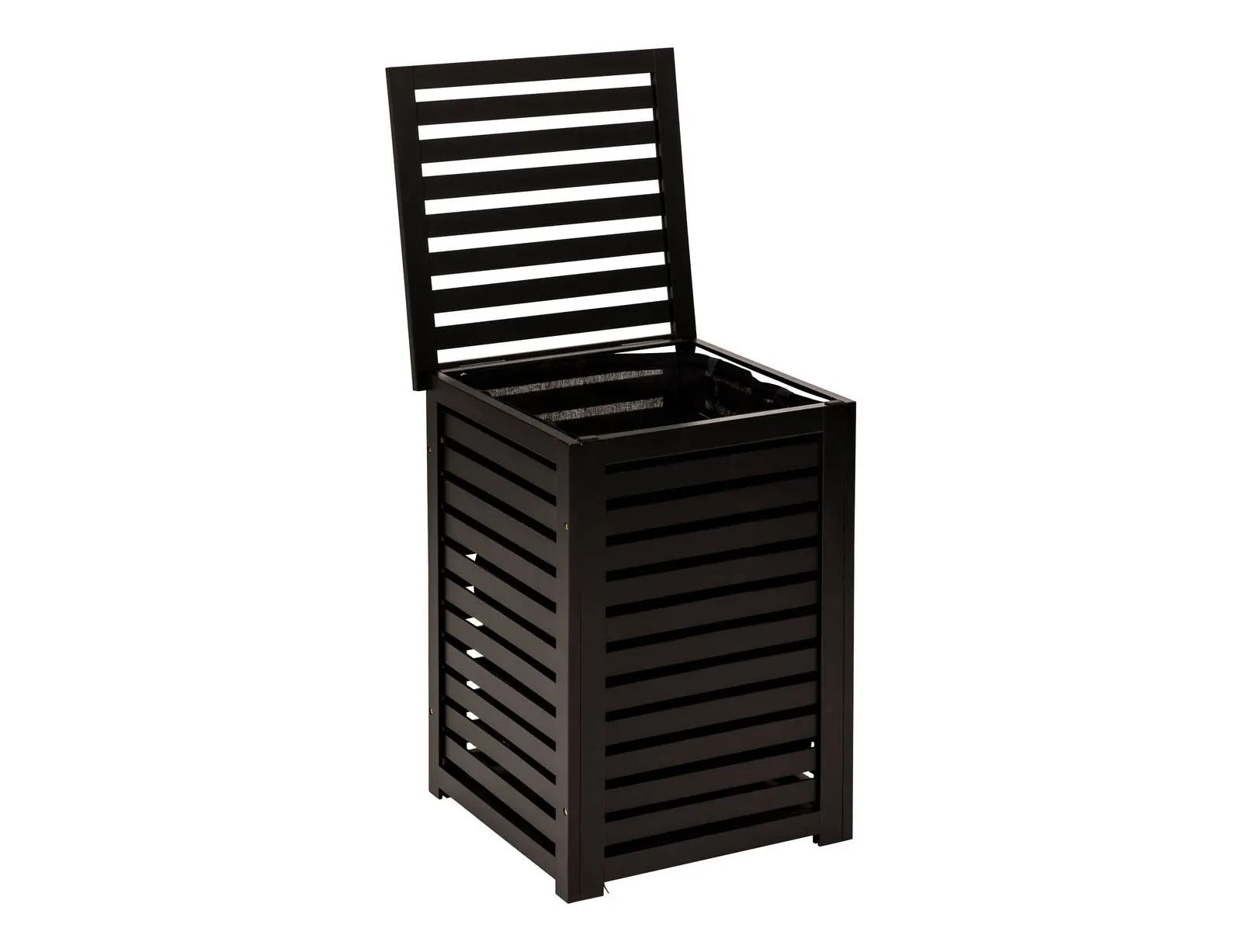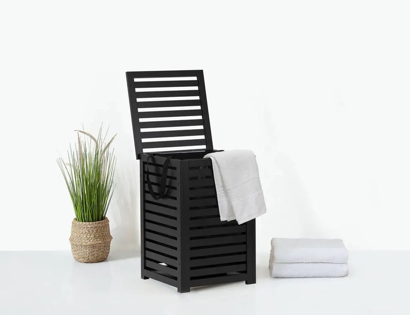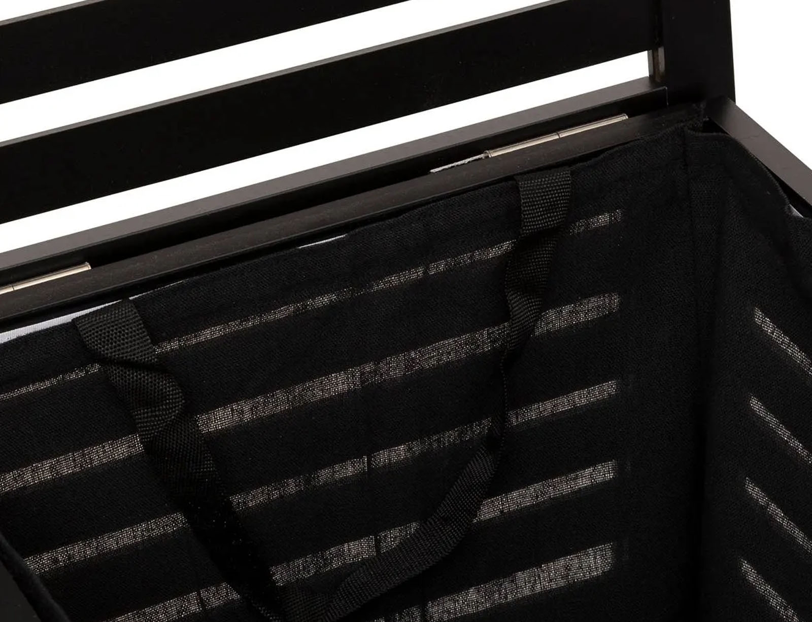 Καλάθι απλύτων με καπάκι κατασκευασμένο από MDF σε μαύρη απόχρωση. Το καλάθι ρούχων είναι απόλυτα κατάλληλο για μικρούς χώρους και κρατά τα βρώμικα ρούχα σας κρυμμένα. Το ανθεκτικό υλικό και η πολυτελής εμφάνιση αυτού του καλαθιού για άπλυτα ρούχα δίνουν στο μπάνιο σας μια εντελώς νέα εμφάνιση. Εσωτερικά διαθέτει υφασμάτινη θήκη για να μην φεύγουν τα ρούχα σας έξω από το καλάθι.