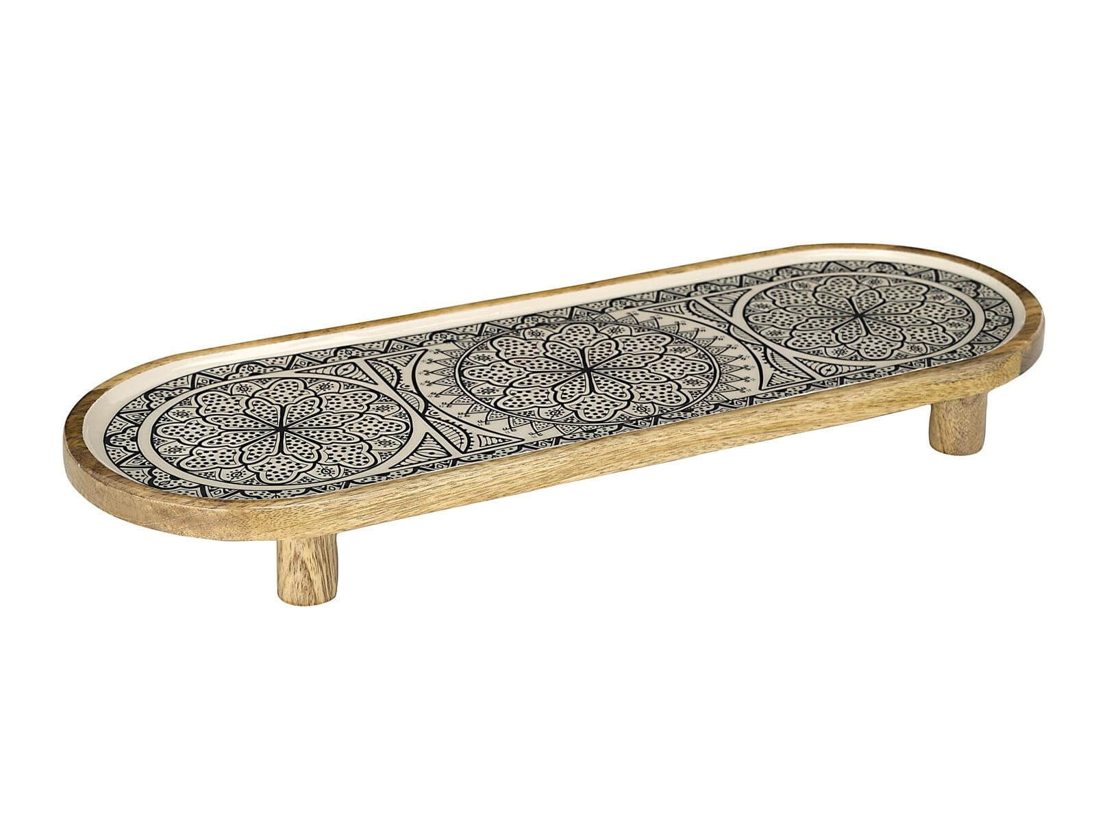 H επιφάνεια σερβιρίσματος της εταιρείας Home Deco Factory αποτελεί ένα πρακτικό στοιχείο για το σπίτι σας, αφού μπορείτε να σερβίρετε ότι θέλετε ή ακόμα να την έχετε και ως διακοσμητικό στην κουζίνα ή στο τραπέζι σας. Διαθέτει 4 πόδια στήριξης για να ξεχωρίζει στο τραπέζι σας. Είναι κατασκευασμένο από ξύλο μάνγκο, ένα σκληρό ξύλο λόγω της αντοχής, της πυκνότητας, της ελκυστικής εμφάνισης και φυσικά της αντοχής του που του επιτρέπει να μην φθείρεται γρήγορα και να διατηρεί την υψηλή του στιλπνότητα για πολλά χρόνια. Συνίσταται το πλύσιμο στο χέρι αφού εξασφαλίζει πολύ μεγάλη διάρκεια ζωής.
