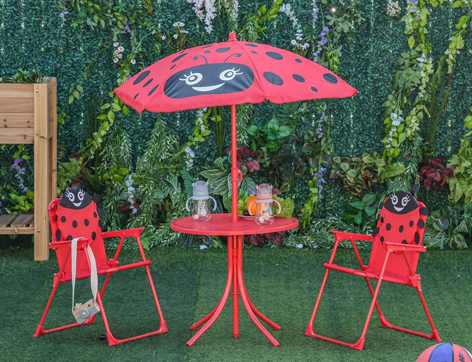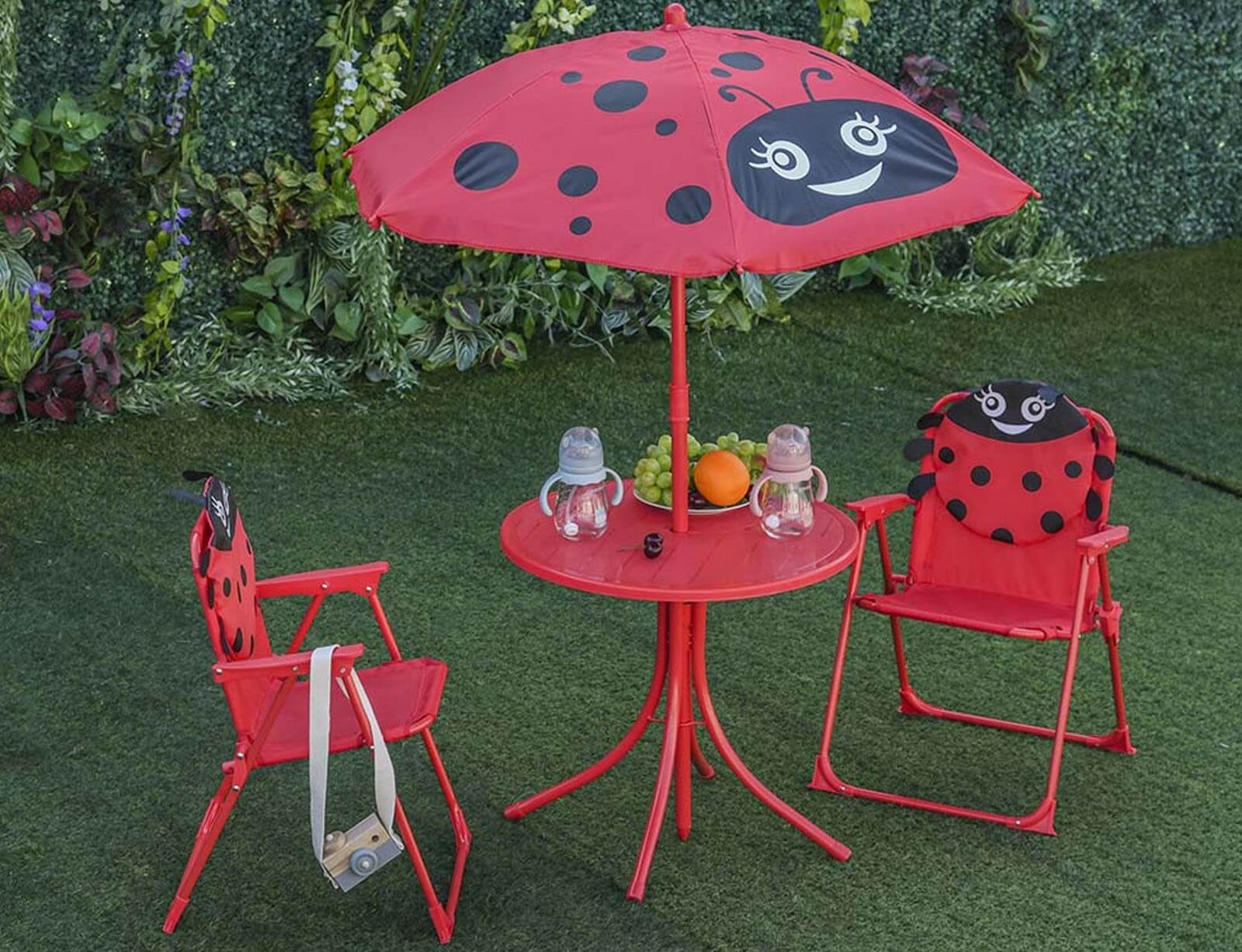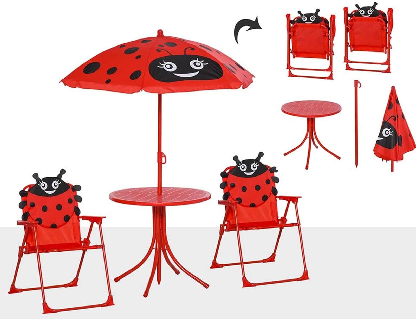 Μεταμορφώστε κάθε εξωτερικό χώρο σε έναν πολύχρωμο παιδικό παράδεισο με το παιδικό σετ κήπου “Πασχαλίτσα”! Το σετ περιλαμβάνει στρογγυλό τραπεζάκι, δύο άνετες παιδικές καρέκλες και ομπρέλα σκίασης, όλα σε ζωηρό κόκκινο χρώμα με παιχνιδιάρικες μαύρες λεπτομέρειες και χαμογελαστά προσωπάκια πασχαλίτσας. Ο στιβαρός μεταλλικός σκελετός εξασφαλίζει αντοχή και σταθερότητα, ενώ ο εργονομικός σχεδιασμός προσφέρει άνεση και ασφάλεια στα παιδιά. Η ομπρέλα προστατεύει αποτελεσματικά από τον ήλιο και μπορείτε εύκολα να ρυθμίσετε το ύψος της.