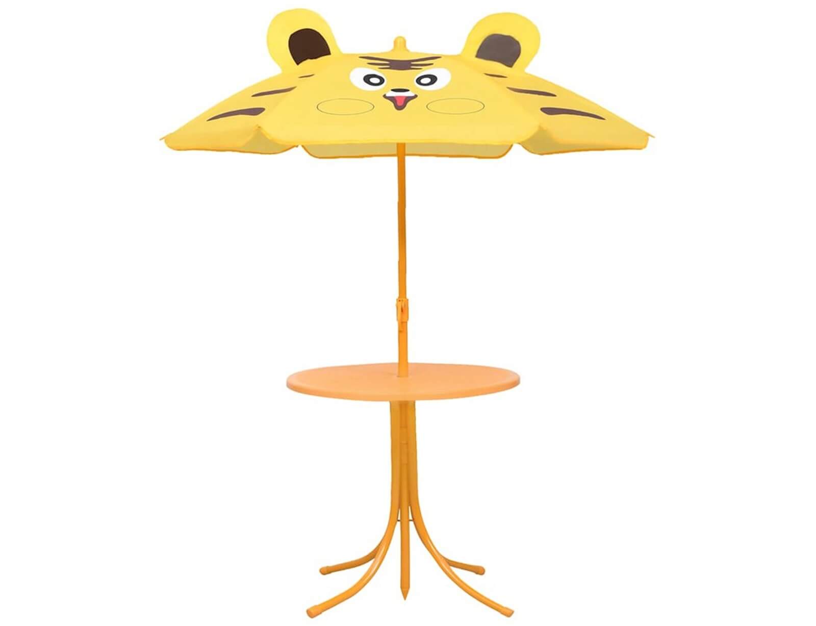 Το παιδικό σετ κήπου με σχέδιο τίγρη περιλαμβάνει ένα τραπέζι, δύο καρέκλες και μία ομπρέλα και είναι ιδανικό για παιχνίδι και χαλάρωση σε κήπο ή μπαλκόνι. Ο ανθεκτικός σκελετός προσφέρει σταθερότητα και ασφάλεια, ενώ η ομπρέλα προστατεύει από τον ήλιο. Οι καρέκλες είναι πτυσσόμενες και ο ιστός ομπρέλας  ρυθμιζόμενος για εύκολη αποθήκευση και το σετ συναρμολογείται γρήγορα και εύκολα.