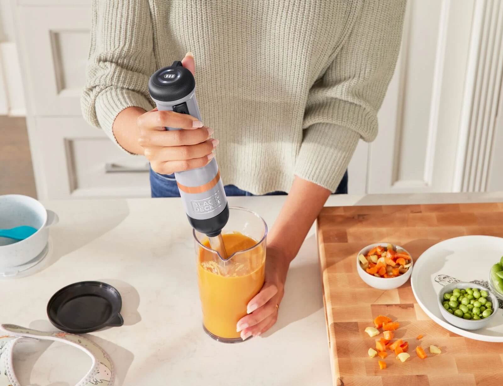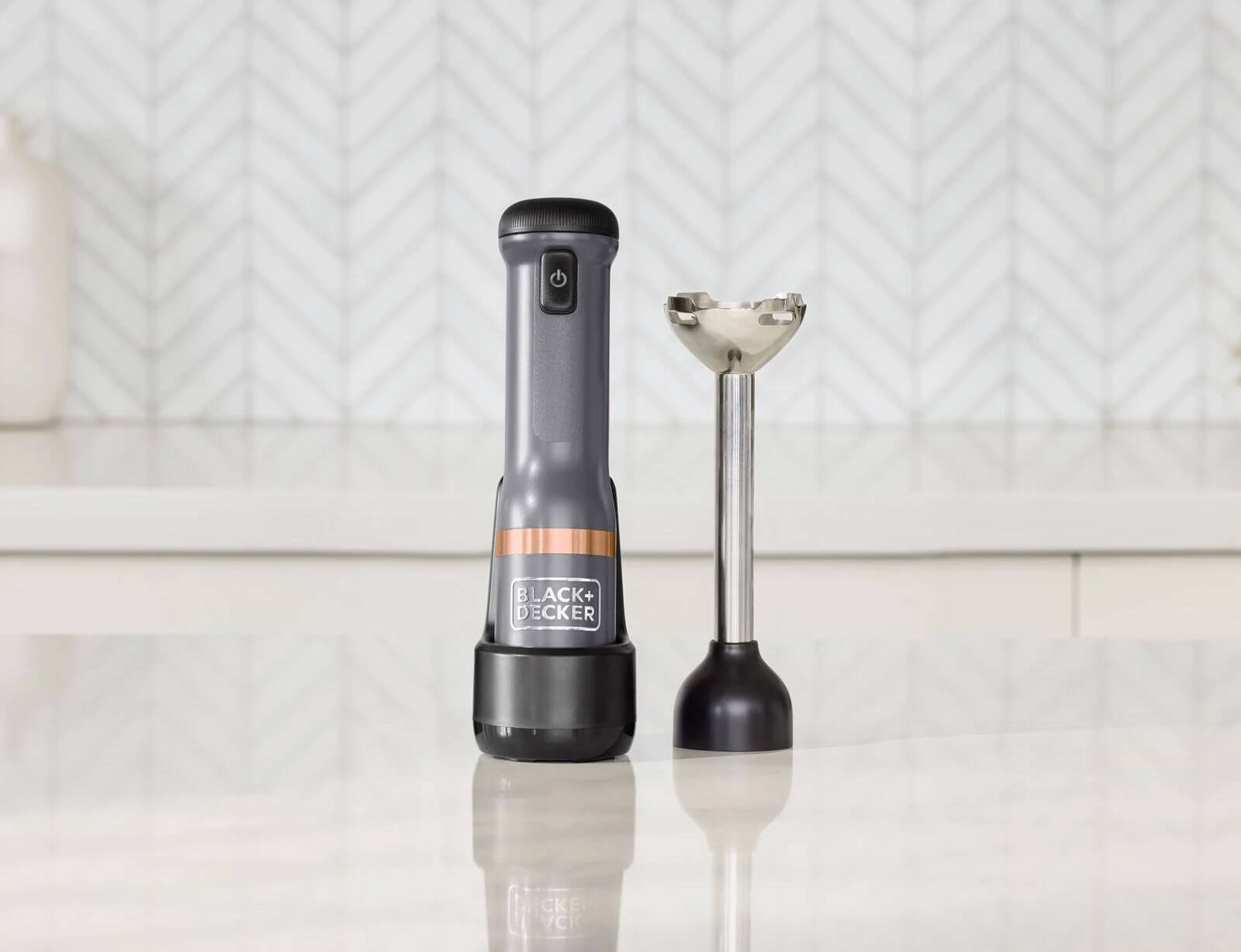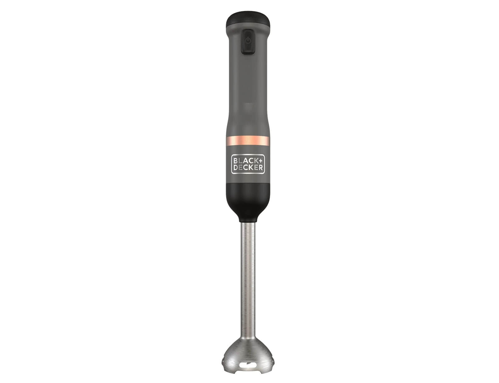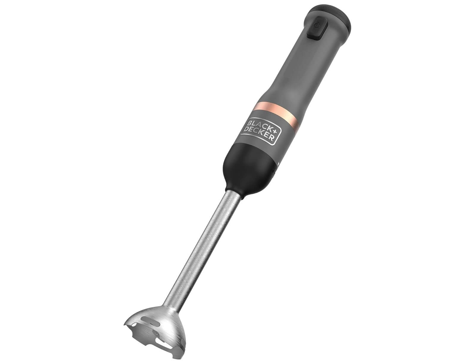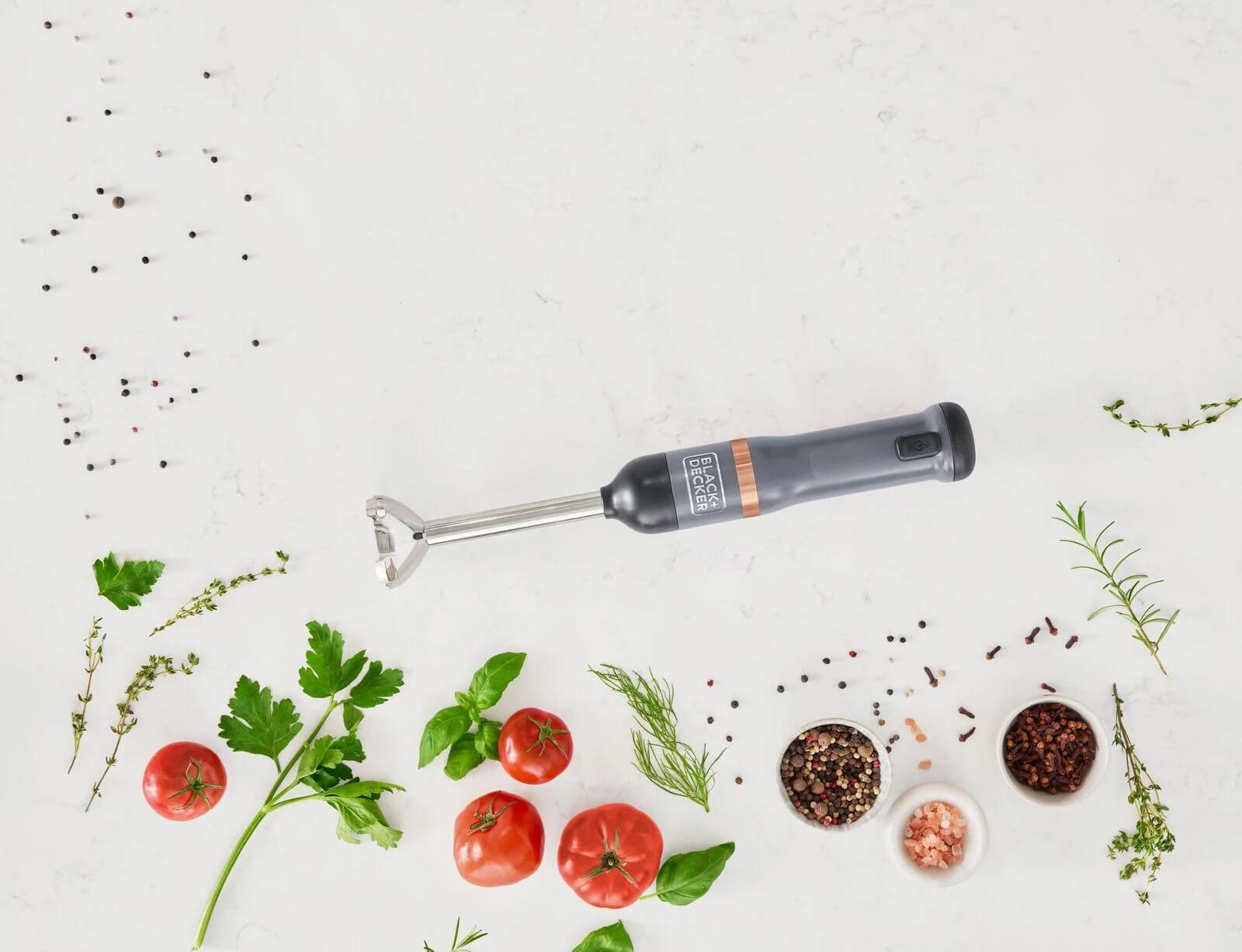 Το ραβδομπλέντερ της BLACK+DECKER είναι μια ασύρματη, πολυλειτουργική συσκευή κουζίνας με εναλλάξιμα εξαρτήματα σε μινιμαλιστικό γκρι και χάλκινο σχεδιασμό. Με τέσσερις λεπίδες από ανοξείδωτο ατσάλι και κεφαλή ανάμειξης σε σχήμα καμπάνας, το μπλέντερ χειρός επιτρέπει τον αποτελεσματικό τεμαχισμό και τον πουρέ τροφίμων. Μετά τη χρήση, το εξάρτημα μπλέντερ μπορεί εύκολα να αφαιρεθεί και να καθαριστεί. Το ραβδομπλέντερ της BLACK+DECKER είναι μια ευέλικτη συσκευή κουζίνας all-in-one με ενσωματωμένη μπαταρία, εύκολο χειρισμό με το ένα χέρι και σύστημα εναλλάξιμων εξαρτημάτων που εξοικονομεί χώρο.