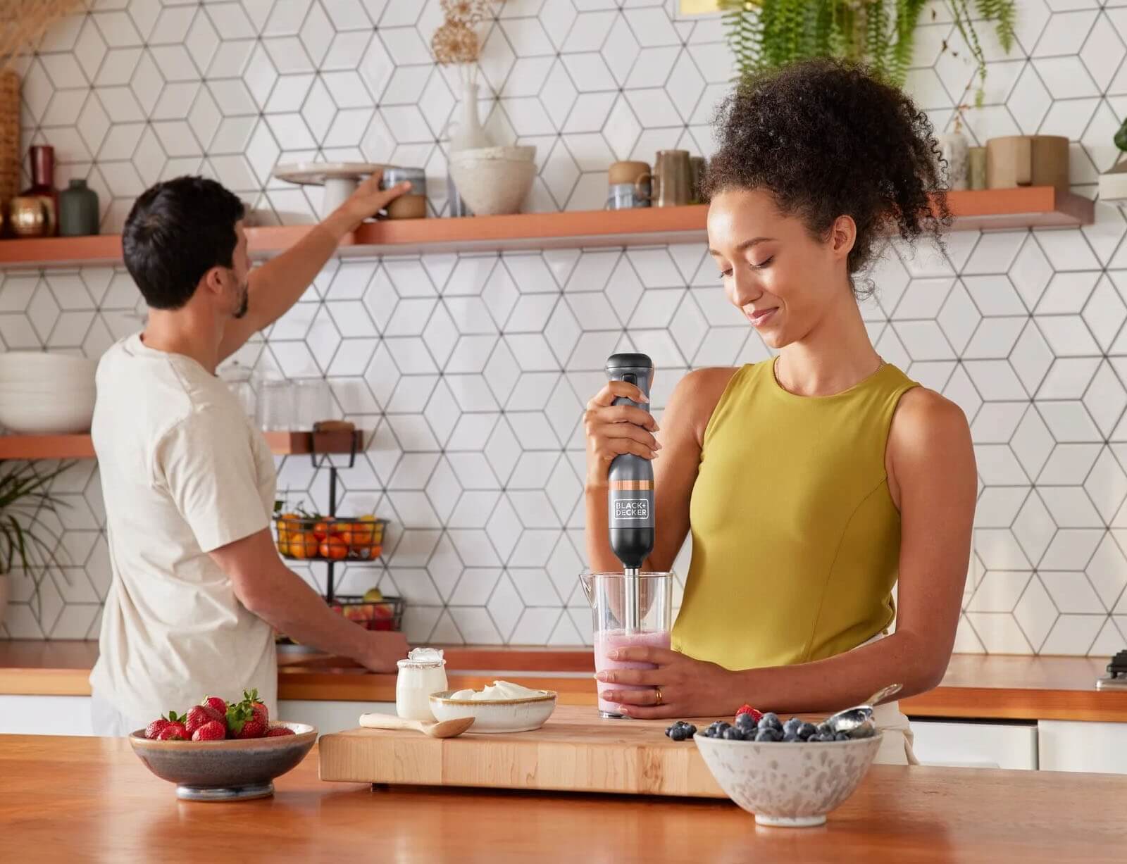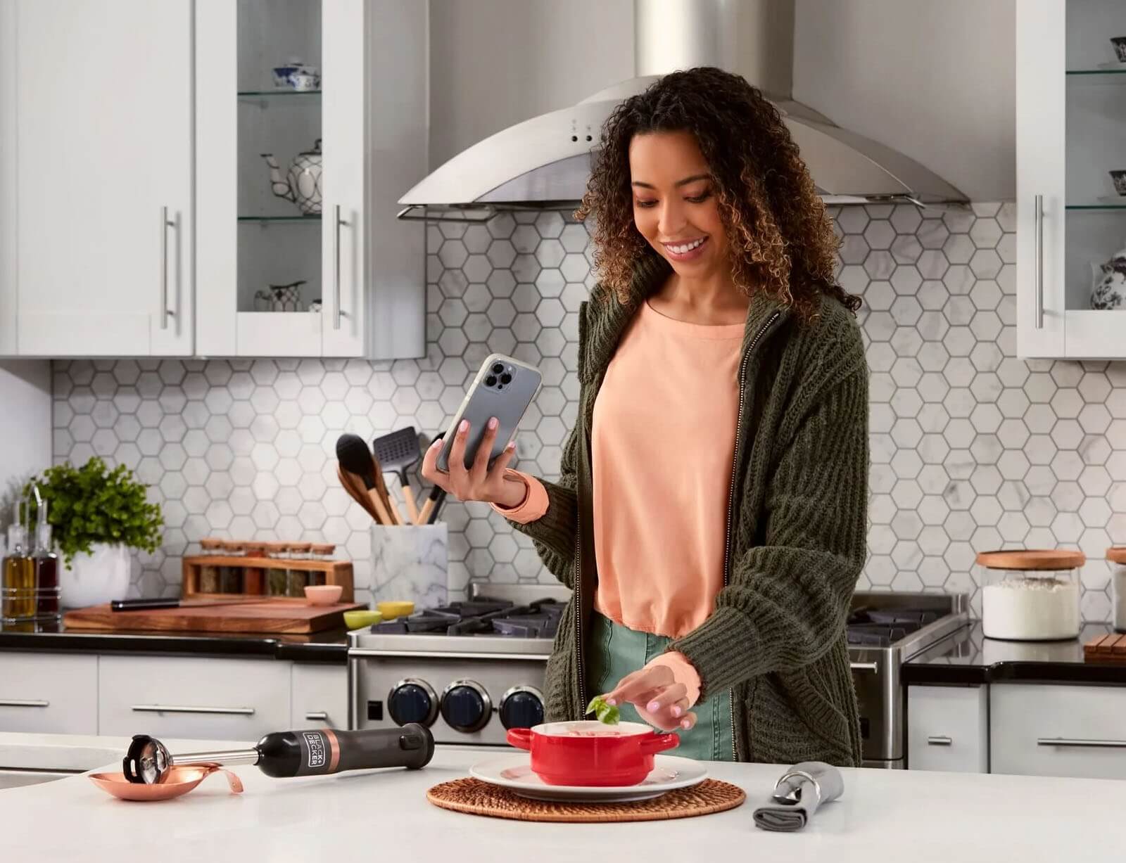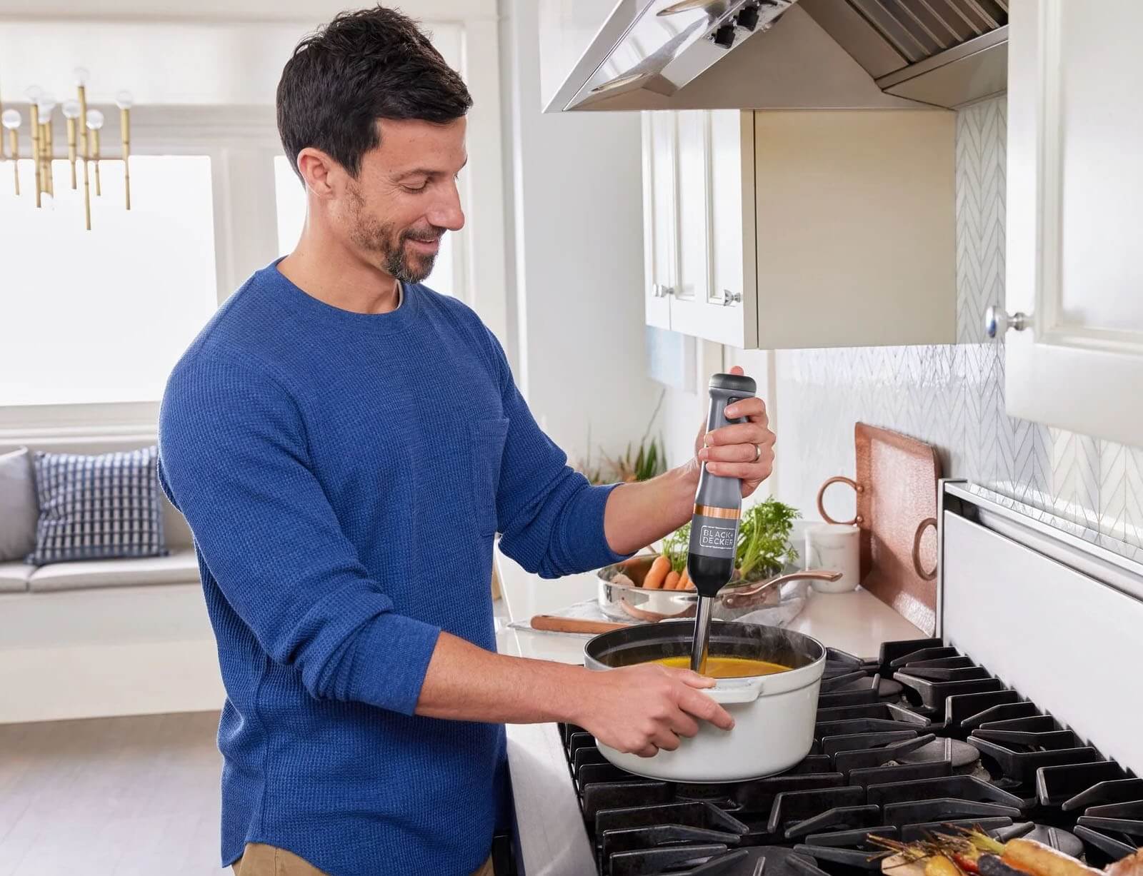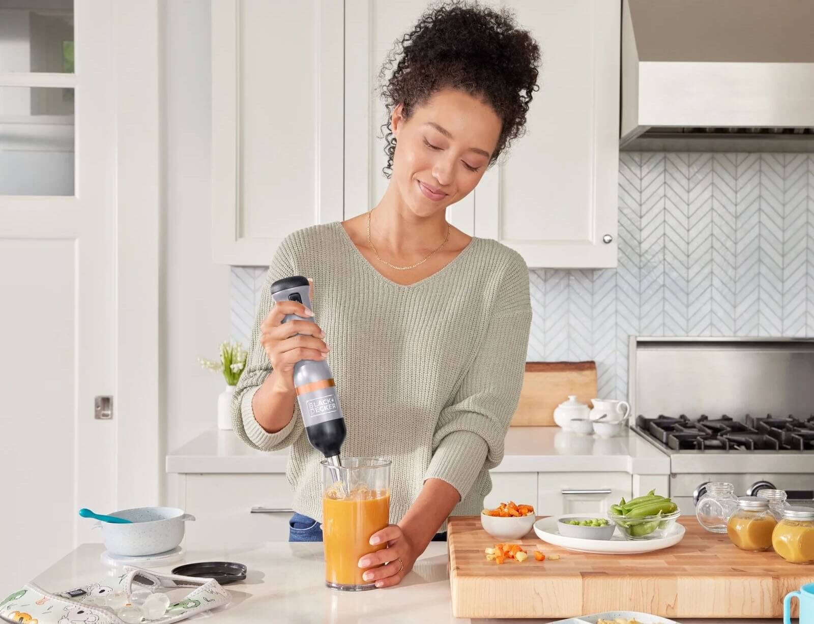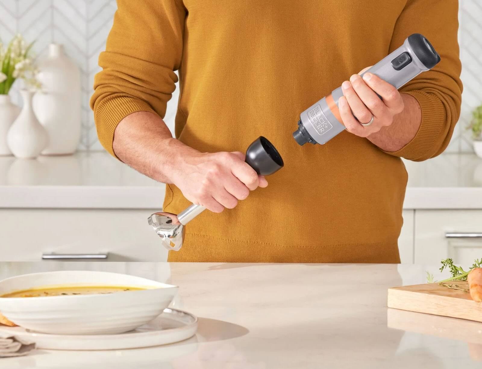 Το ραβδομπλέντερ της BLACK+DECKER είναι μια ασύρματη, πολυλειτουργική συσκευή κουζίνας με εναλλάξιμα εξαρτήματα σε μινιμαλιστικό γκρι και χάλκινο σχεδιασμό. Με τέσσερις λεπίδες από ανοξείδωτο ατσάλι και κεφαλή ανάμειξης σε σχήμα καμπάνας, το μπλέντερ χειρός επιτρέπει τον αποτελεσματικό τεμαχισμό και τον πουρέ τροφίμων. Μετά τη χρήση, το εξάρτημα μπλέντερ μπορεί εύκολα να αφαιρεθεί και να καθαριστεί. Το ραβδομπλέντερ της BLACK+DECKER είναι μια ευέλικτη συσκευή κουζίνας all-in-one με ενσωματωμένη μπαταρία, εύκολο χειρισμό με το ένα χέρι και σύστημα εναλλάξιμων εξαρτημάτων που εξοικονομεί χώρο.