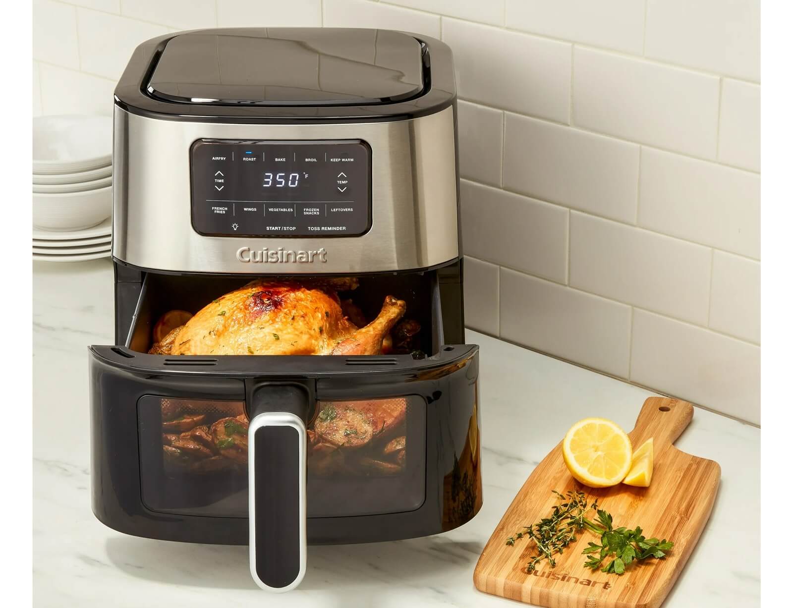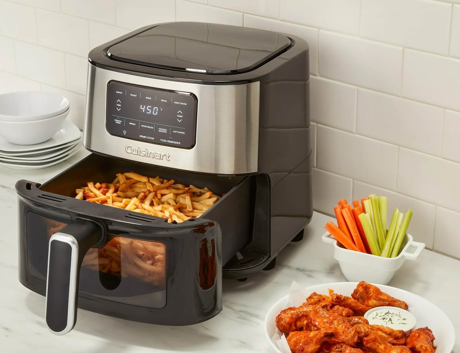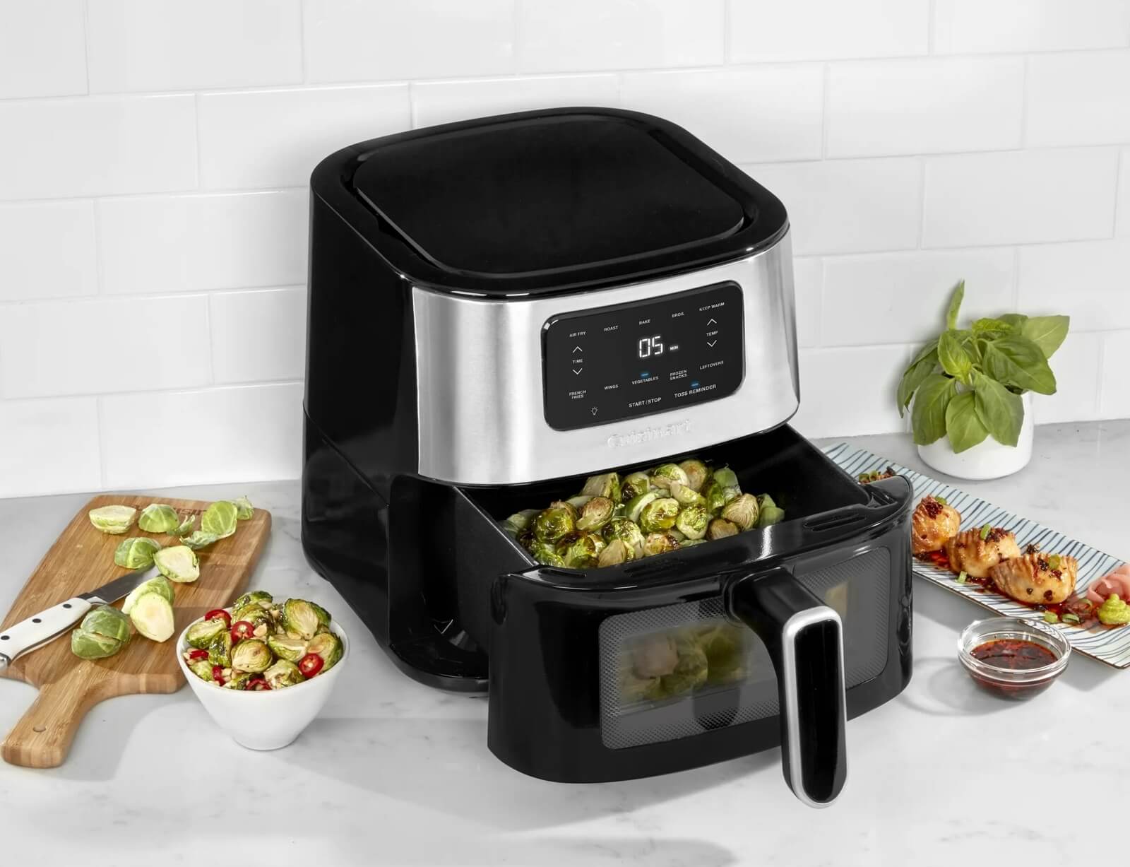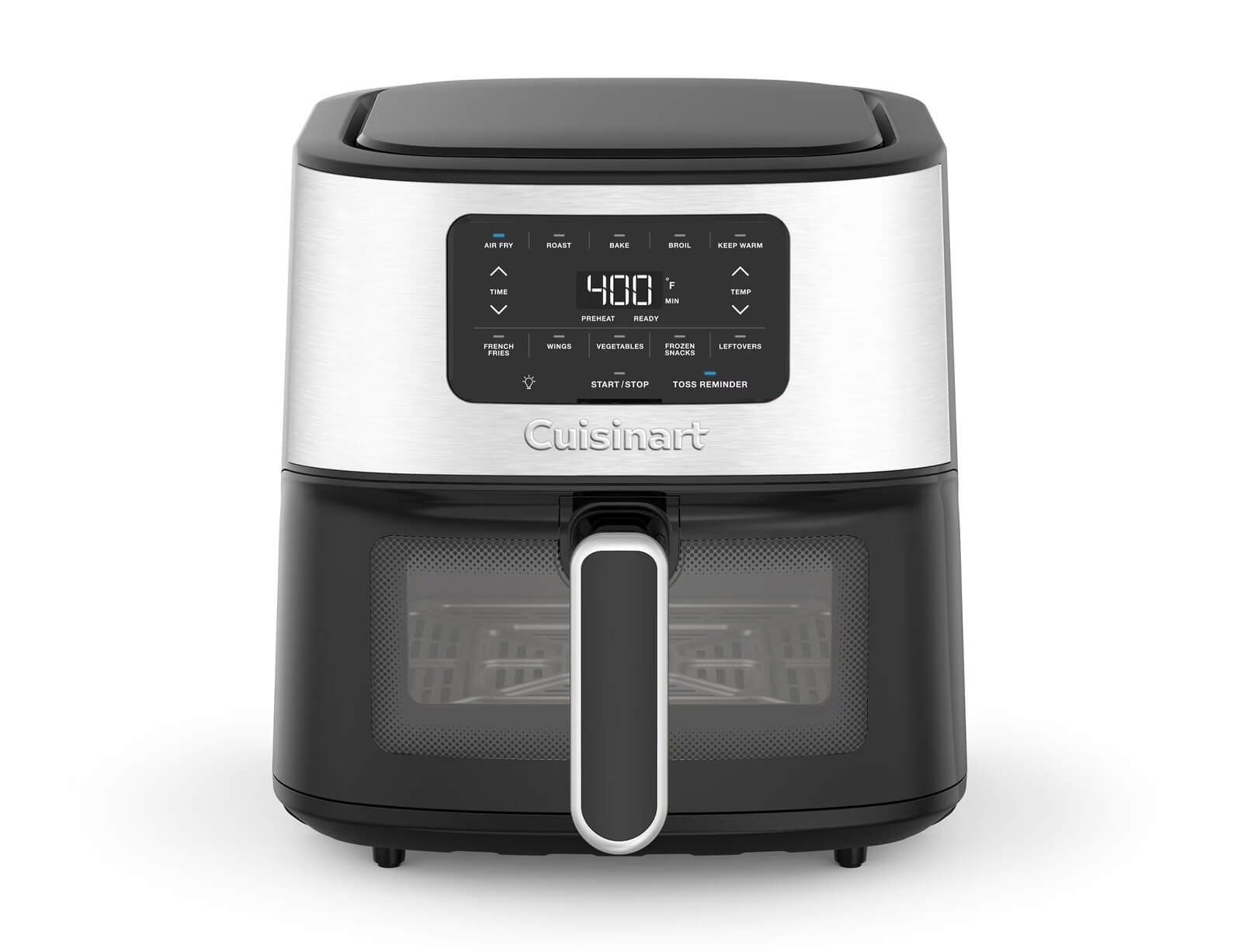 Μαγειρέψτε τα πάντα, από απλά σνακ μέχρι κυρίως γεύματα, με την ευέλικτη φριτέζα αέρα Cuisinart ® Basket. Αυτή η φριτέζα αέρος φτιάχει τα τηγανητά φαγητά γρήγορα, χρησιμοποιώντας λίγο ή καθόλου λάδι, για να φτιάχνετε υγιεινά γεύματα με την τραγανότητα που αγαπάτε. Πέντε δημοφιλείς προγραμματισμένες ρυθμίσεις, μια ειδοποίηση περιστροφής για να γυρίσετε το φαγητό στη μέση του μαγειρέματος και ένα βολικό παράθυρο προβολής διευκολύνουν το τηγάνισμα, το ψήσιμο, το ψήσιμο στο γκριλ και το ζέσταμα του φαγητού στον αέρα με πεντανόστιμα αποτελέσματα κάθε φορά. Αναβαθμίστε το μενού σας με την φριτέζα αέρα της Cuisinart.