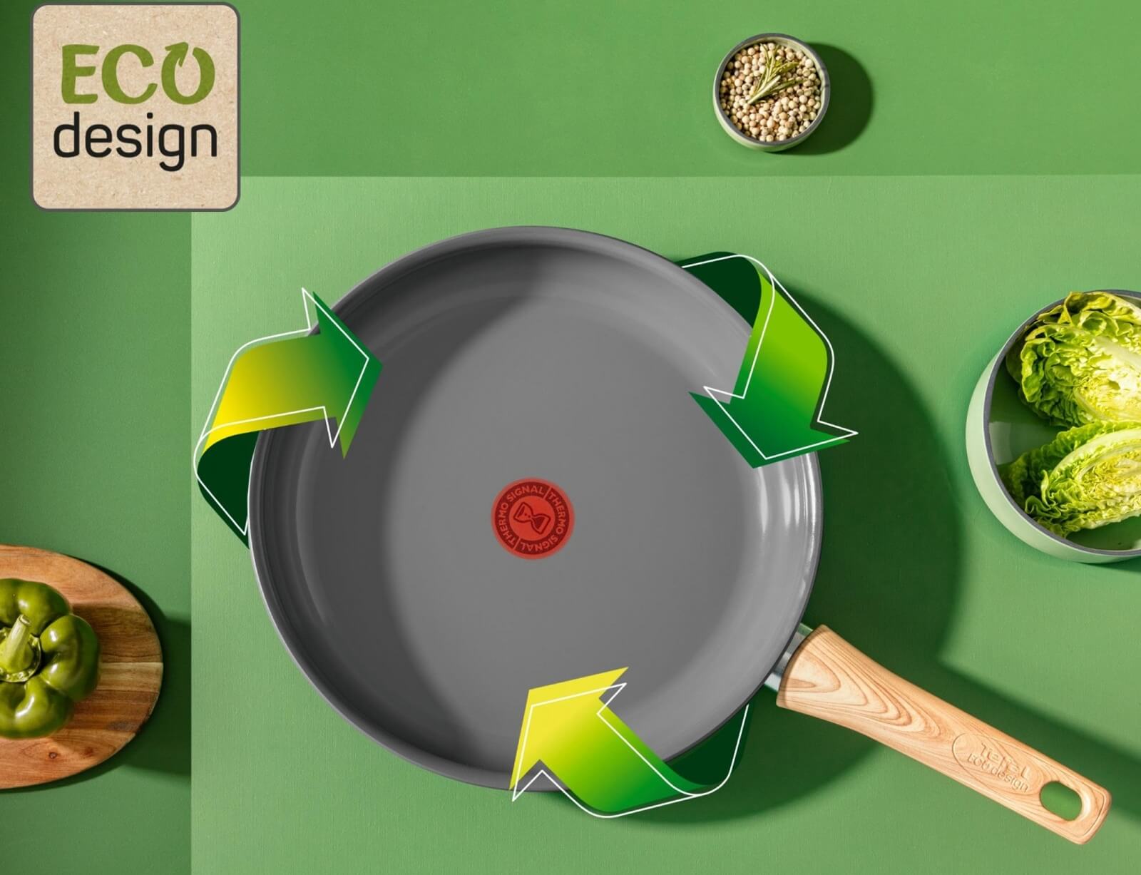 Ανακαλύψτε ένα τηγάνι που συνδυάζει μοντέρνες γραμμές και γαλλική τεχνογνωσία μέχρι την τελευταία λεπτομέρεια, όπως το φινίρισμα με εφέ ξύλου και το οικολογικό λογότυπο στη λαβή.