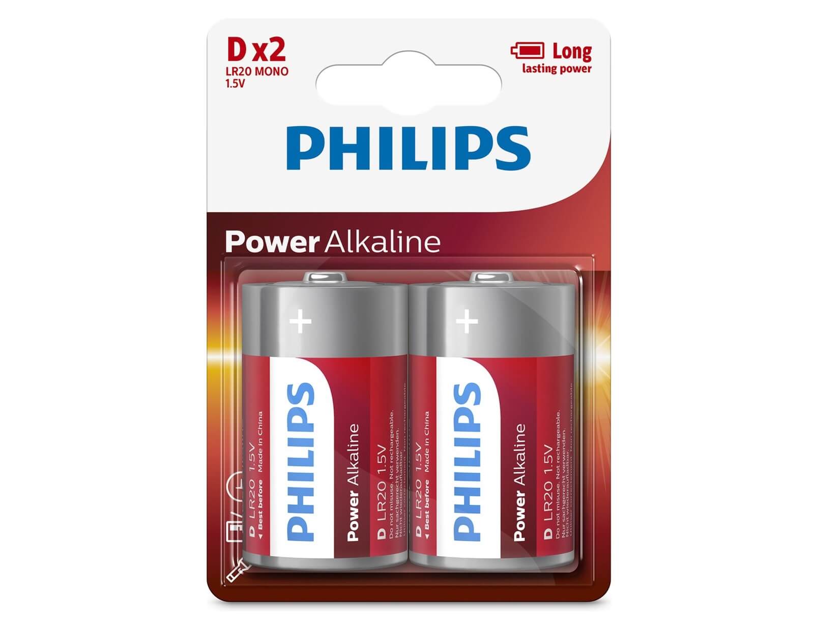 Αλκαλικές μπαταρίες της Philips μεγέθους D, κατάλληλες για μικροσυσκευές όπως φακοί, παιχνίδια, τηλεχειριστήρια, ραδιόφωνα και για οποιαδήποτε συσκευή χρησιμοποιεί D μπαταρίες.