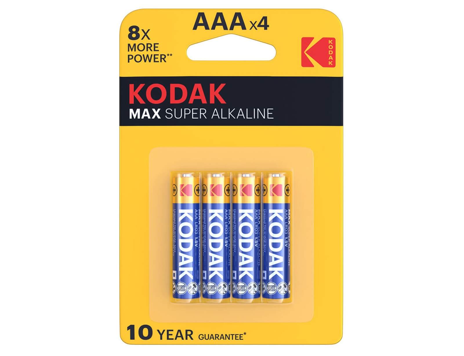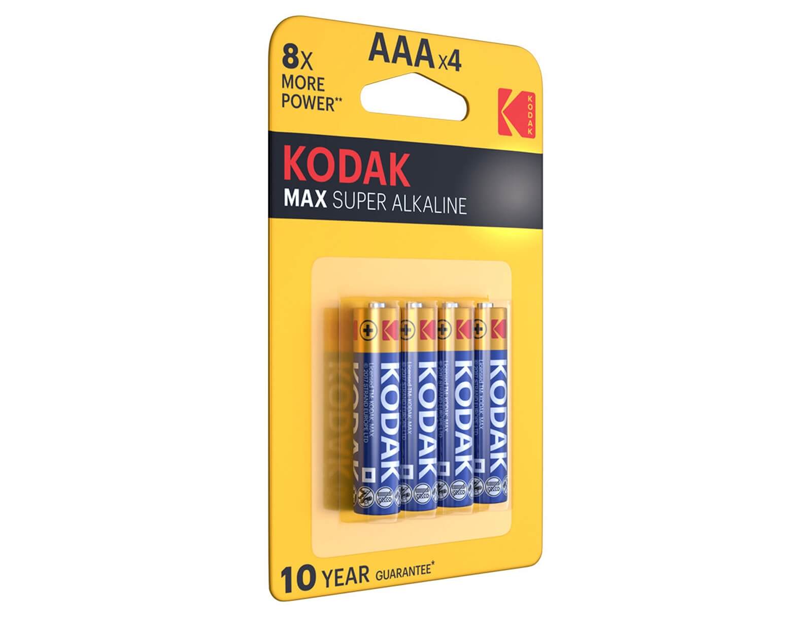 Αλκαλικές μπαταρίες της Kodak μεγέθους AΑΑ, κατάλληλες για μικροσυσκευές όπως φακοί, παιχνίδια, τηλεχειριστήρια, αριθμομηχανές και για οποιαδήποτε συσκευή χρησιμοποιεί AAA μπαταρίες.