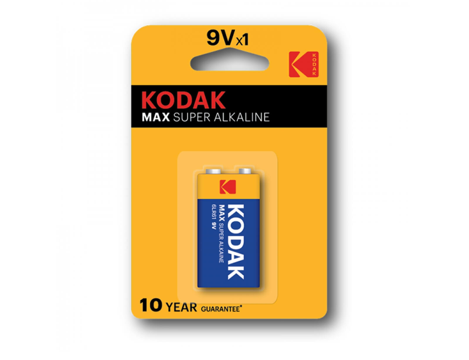 Αλκαλική μπαταρία της Kodak μεγέθους 9V, κατάλληλη για μικροσυσκευές όπως φακοί, μουσικά όργανα, ραδιόφωνα, παιχνίδια και άλλες ηλεκτρονικές συσκευές και για οποιαδήποτε συσκευή χρησιμοποιεί 9V μπαταρίες.