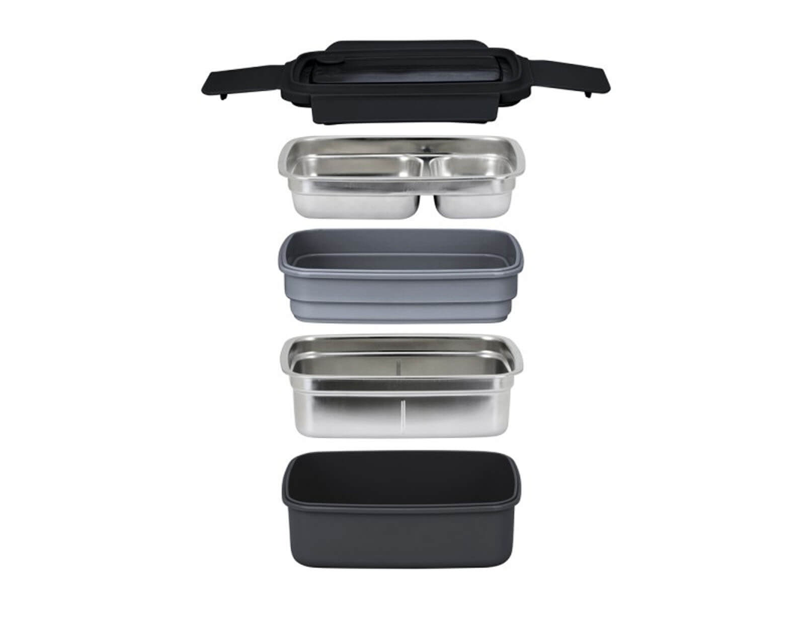 Πρακτικό και λειτουργικό, αυτό το διώροφο δοχείο φαγητού είναι ιδανικό για τον διαχωρισμό και τη μεταφορά των γευμάτων σας. Διαθέτει συνολική χωρητικότητα 1000 ml (600 ml + 400 ml), επιτρέποντάς σας να μεταφέρετε διαφορετικά τρόφιμα χωρίς να αναμειγνύονται. Το αεροστεγές καπάκι με 4 κλιπ ασφαλείας εξασφαλίζει άριστη διατήρηση της φρεσκάδας και της γεύσης, ενώ η θερμομονωτική κατασκευή από ανοξείδωτο ατσάλι διατηρεί το φαγητό ζεστό ή κρύο έως και 3 ώρες. Είναι πλήρως κατάλληλο για πλυντήριο πιάτων, προσφέροντας ευκολία στην καθημερινή χρήση, ενώ τα μεταλλικά μέρη δεν είναι κατάλληλα για φούρνο μικροκυμάτων.