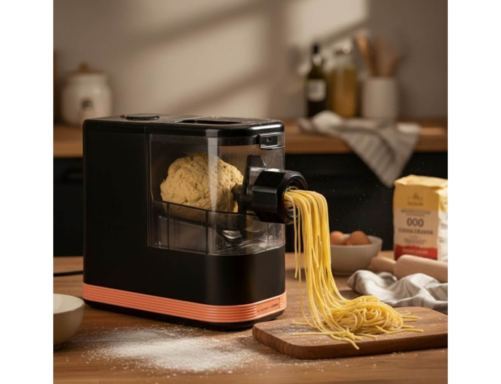 Ο παρασκευαστής ζυμαρικών Livoo DOP259CO σας επιτρέπει να φτιάχνετε φρέσκα ζυμαρικά σε μόλις 10 λεπτά, ιδανικά για γεύματα 3-4 ατόμων. Μπορεί να παράγει έως 440 g ζυμαρικών από 360 g αλεύρι, για γρήγορη και εύκολη προετοιμασία.