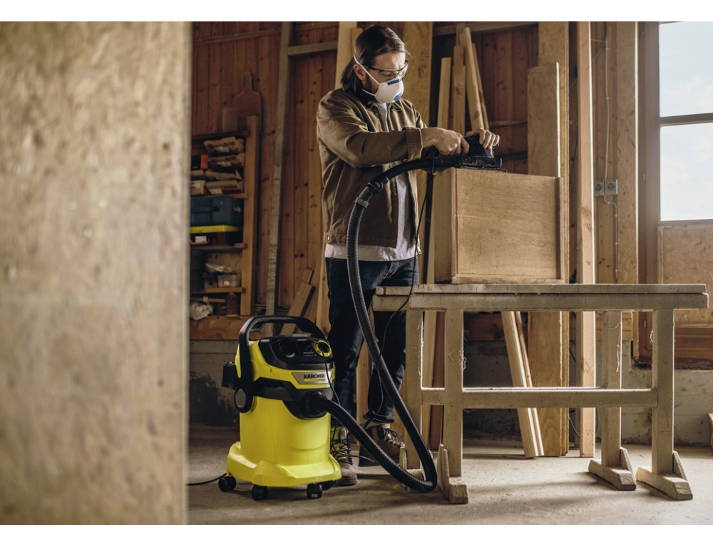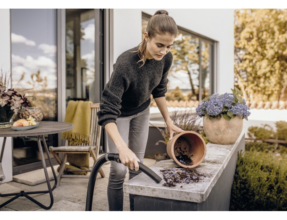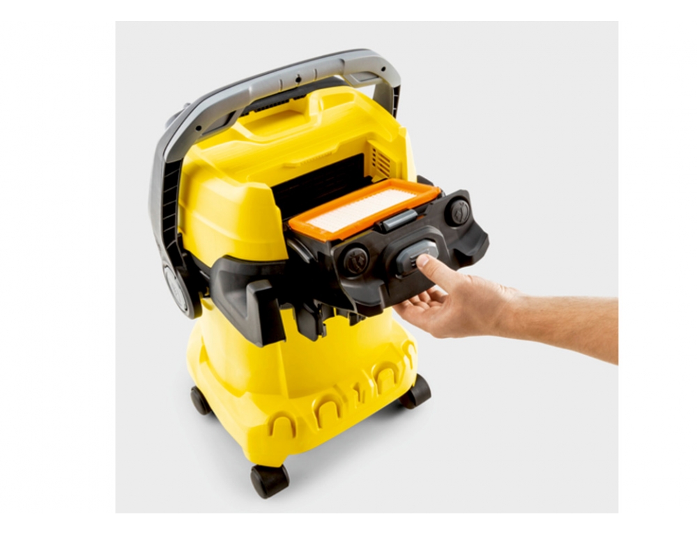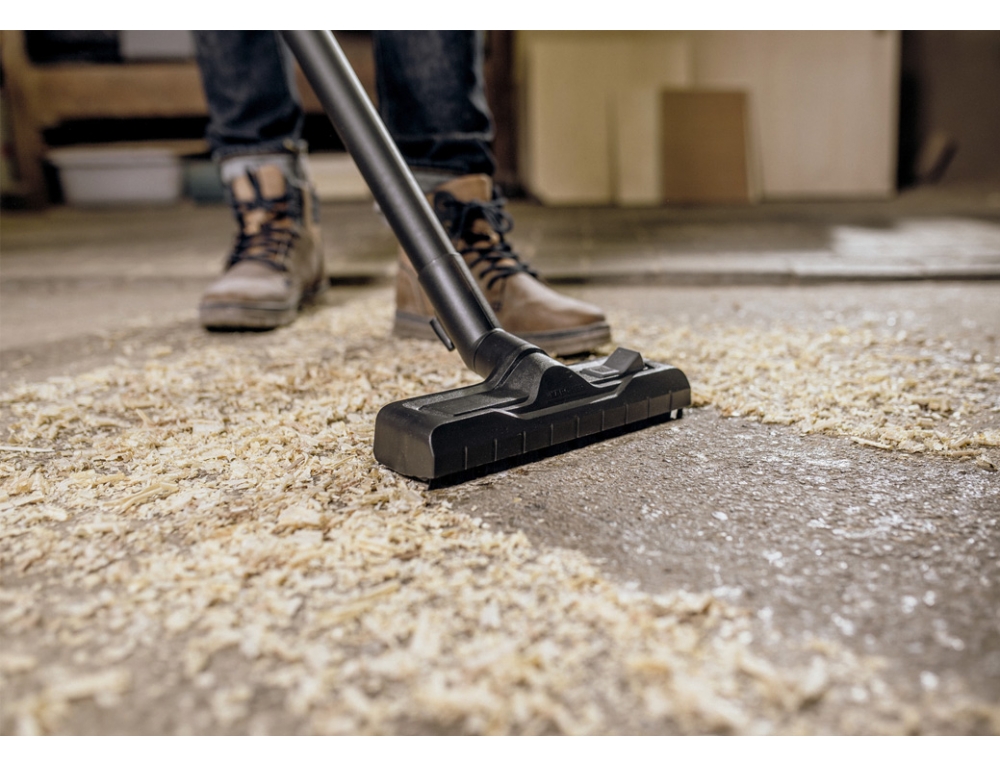 Η ηλεκτρική σκούπα WD 5 P V-25/5/22 για υγρή και ξηρή αναρρόφηση με κατανάλωση ρεύματος 1100 watt επιτυγχάνει τέλεια αποτελέσματα καθαρισμού σε όλους τους τύπους βρομιάς - είτε στεγνή είτε υγρή, λεπτή είτε χοντρή. Η συσκευή διαθέτει πλαστικό δοχείο 25 λίτρων, καλώδιο 5 μέτρων, εύκαμπτο σωλήνα αναρρόφησης μήκους 2,2 μέτρων, εναλλάξιμο ακροφύσιο δαπέδου, επίπεδο πτυχωτό φίλτρο και σακούλα φίλτρου fleece. Η ενσωματωμένη πρίζα ρεύματος με αυτόματο διακόπτη on/off επιτρέπει τη σύνδεση ηλεκτρικών εργαλείων. Η βρωμιά που προκύπτει από το πριόνισμα ή το τρίψιμο αναρροφάται απευθείας. Ο περιστροφικός διακόπτης μπορεί να χρησιμοποιηθεί για τη ρύθμιση της ισχύος αναρρόφησης όπως απαιτείται. Χάρη στην κατοχυρωμένη με δίπλωμα ευρεσιτεχνίας τεχνολογία αφαίρεσης φίλτρου, το επίπεδο πτυχωτό φίλτρο μπορεί να αφαιρεθεί σε δευτερόλεπτα, αποφεύγοντας οποιαδήποτε επαφή με τη βρωμιά. Το κουμπί καθαρισμού του φίλτρου μπορεί να πατηθεί για να καθαρίσει αποτελεσματικά το φίλτρο και να αποκαταστήσει την ισχύ αναρρόφησης. Η αφαιρούμενη λαβή με ηλεκτροστατική προστασία επιτρέπει την τοποθέτηση αξεσουάρ απευθείας στον εύκαμπτο σωλήνα αναρρόφησης. Ο εύκαμπτος σωλήνας μπορεί να ασφαλιστεί στην κεφαλή της συσκευής για εξοικονόμηση χώρου αποθήκευσης. Η θέση στάθμευσης που παρέχεται στον προφυλακτήρα επιτρέπει την γρήγορη και βολική αποθήκευση των σωλήνων και του ακροφυσίου δαπέδου, όταν κάνεις ένα σύντομο διάλειμμα από την εργασία.